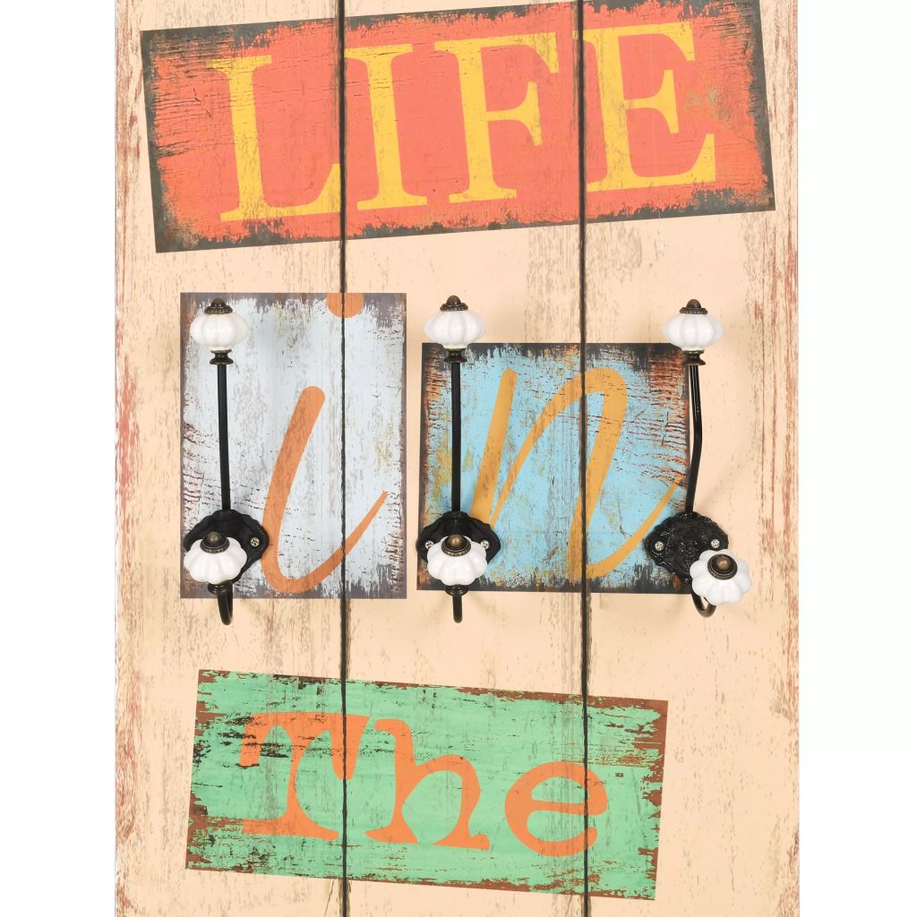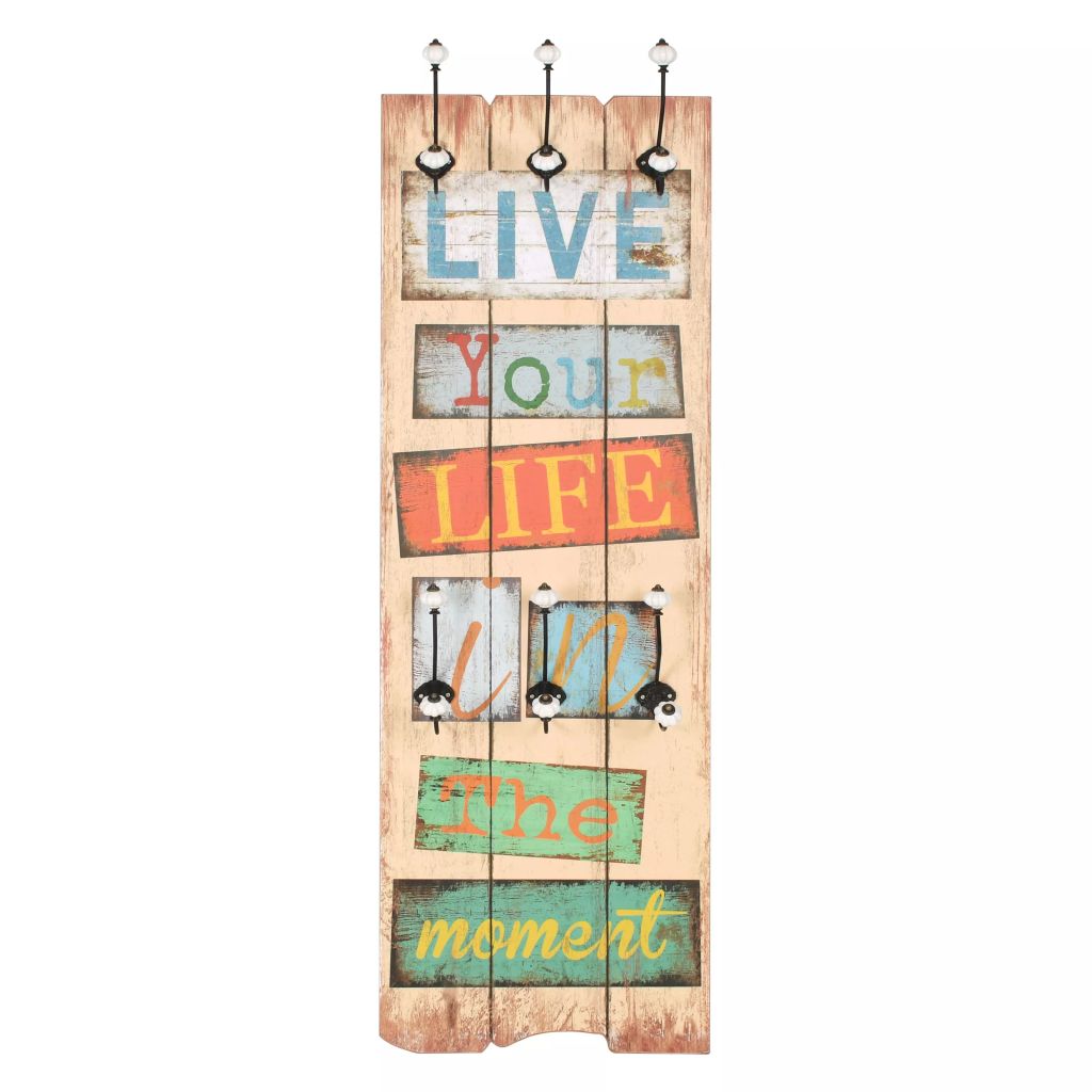 Mit dem Schriftzug im Vintage-Style "Live your life in the moment", wird diese Wandgarderobe mit 6 Haken zu einem echten Hingucker, den Ihre Gäste sofort bemerken werden. Die Garderobe besteht aus MDF-Platte, die sehr robust ist. Sie verfügt über 2 Reihen von 3 exquisiten Metallhaken und bietet daher reichlich Platz für Ihre Mäntel, Taschen, Schals, Hüte oder andere kleine Gegenstände. Mit 2 Befestigungspunkten auf der Rückseite kann die Garderobe einfach an der Wand montiert werden. Die Montage gelingt mühelos. Das Montagematerial ist im Lieferumfang enthalten.