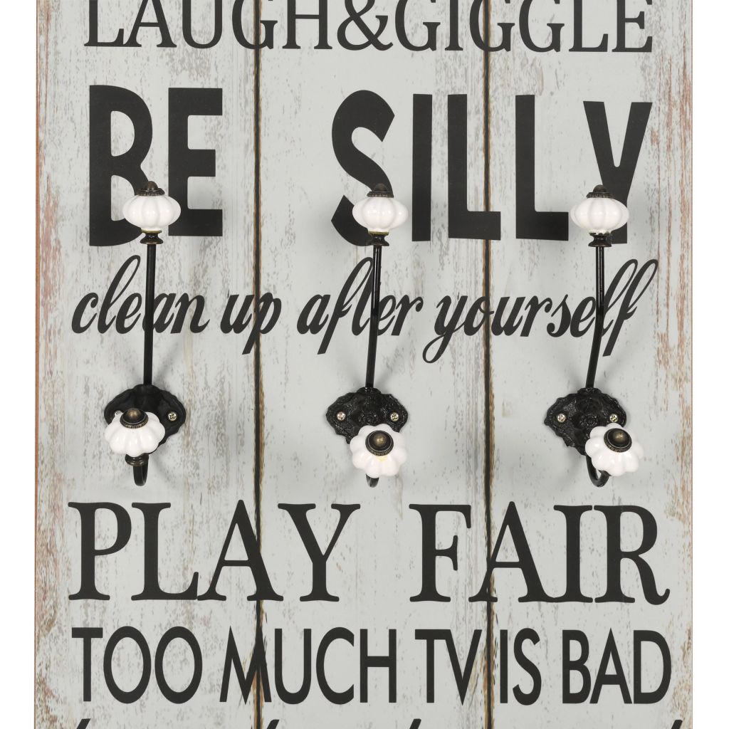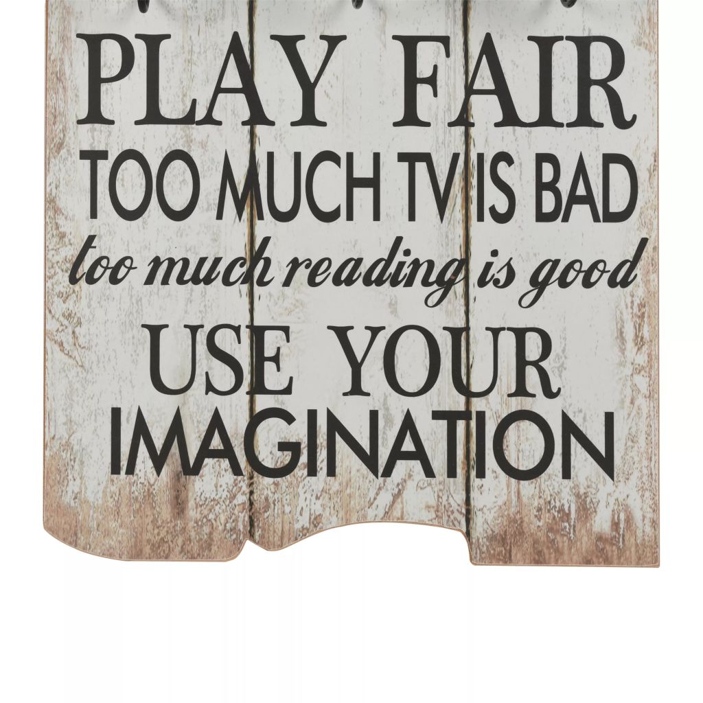 Mit dem Schriftzug im Vintage-Stil "Play room rules Ignore mean ones Thank you Be silly Play fair Use your imagination", wird diese Wandgarderobe mit 6 Haken zu einem echten Hingucker, den Ihre Gäste sofort bemerken werden. Die Garderobe besteht aus MDF-Platte, die sehr robust ist. Sie verfügt über 2 Reihen von 3 exquisiten Metallhaken und bietet daher reichlich Platz für Ihre Mäntel, Taschen, Schals, Hüte oder andere kleine Gegenstände. Mit 2 Befestigungspunkten auf der Rückseite kann die Garderobe einfach an der Wand montiert werden. Die Montage gelingt mühelos. Das Montagematerial ist im Lieferumfang enthalten.