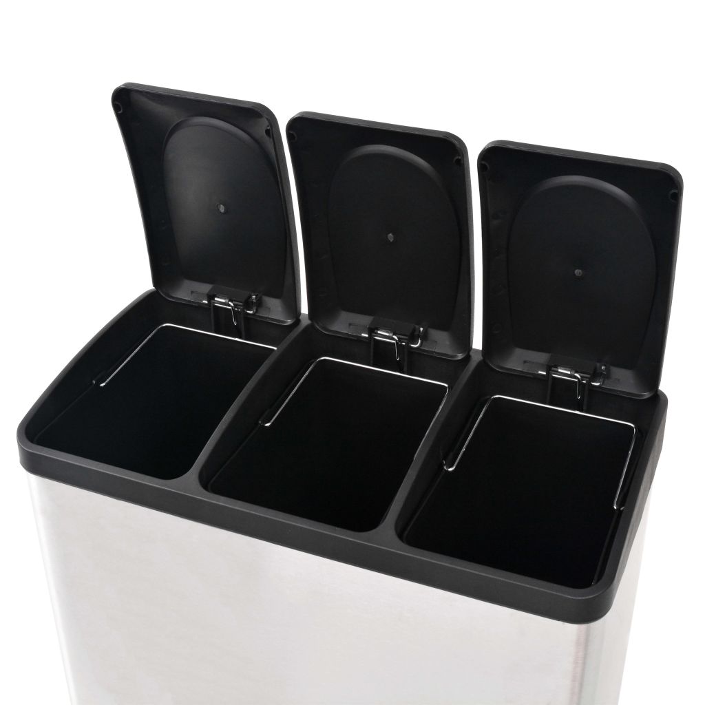 Dieser schicke, praktische Recycling-Treteimer ist ein Must-Have für Ihre Küche, Ihr Wohnzimmer, Ihr Büro usw. Der Mülleimer ist mit 3 herausnehmbaren Inneneimern zum Sortieren des Abfalls ausgestattet. Sie können die Deckel durch die Pedal-Mechanik mühelos öffnen oder schließen. Die Schlitze hinter den Pedalen sind farbcodiert, damit Sie den Abfall auf bequemere Weise sortieren können. Der Mülleimer hat ein Edelstahlgehäuse mit mattem Finish, was ihm einen schicken Look verleiht. Die Inneneimer, Deckel und Boden sind aus strapazierfähigem Polypropylen (PP) gefertigt. Die Soft-Close-Deckel öffnen und schließen sich per Fußpedal geräuschlos. Im geschlossenen Zustand verhindern die Deckel die Verbreitung unangenehmer Gerüche. Jeder Inneneimer verfügt über einen großen Griff und kann leicht herausgenommen werden.