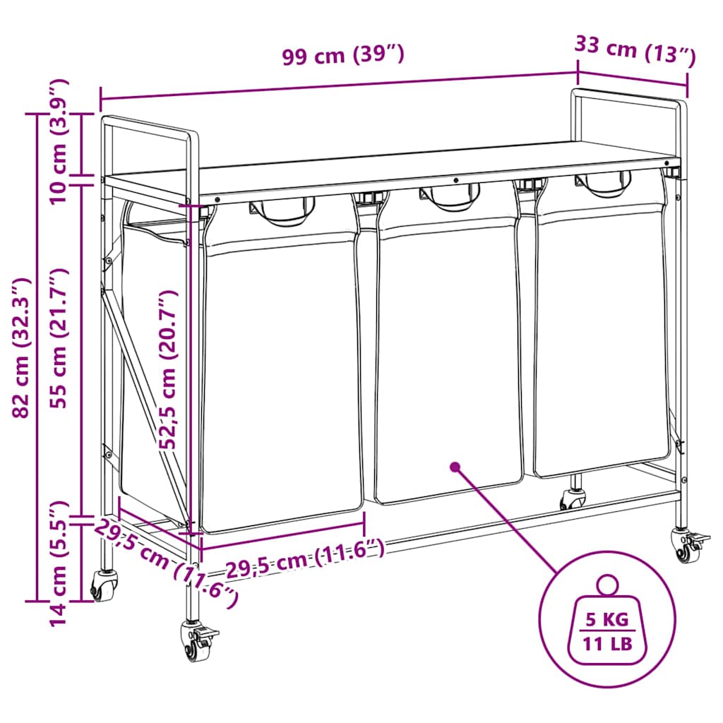 Der Wäschekorb bietet eine geräumige und praktische Aufbewahrungslösung mit ausziehbaren Wäschesäcken und Rollen, die das Ordnen und Transportieren Ihrer Wäsche mühelos machen. Wäschesortierer: Dieser Wäschesortierer bietet Platz für eine großzügige Wäscheladung pro Wäschesack und hilft, Kleidungsstücke nach Farbe oder Stoffart zu sortieren, für einen aufgeräumten Wäschebereich zu sorgen und auch Spielzeug und mehr aufzubewahren.Praktische ausziehbare Wäschesäcke: Die herausnehmbaren Wäschesäcke sind mit ausziehbaren Griffen und Klettverschlüssen zum einfachen Abnehmen und Herausziehen ausgestattet. Die verstärkten Bodenplatten helfen, die Form der Säcke zu erhalten und ein Durchhängen zu verhindern.Robuste und langlebige Struktur: Dieser Wäschekorb kombiniert einen Stahlrahmen mit langlebigem Holzwerkstoff und bietet so hervorragende Festigkeit, Verschleißfestigkeit und Stabilität.Obere Ablagefläche: Der Wäschekorb verfügt über ein oberes Regal und bietet so eine praktische Lösung, um Ihre wichtigsten Dinge griffbereit zu haben. Perfekt zur Aufbewahrung von Toilettenartikeln, Waschmitteln, Weichspülern oder sogar Dekorationsartikeln.Mühelose Mobilität: Dank robuster Räder lässt sich dieser Wäschekorb problemlos von Raum zu Raum rollen. Zwei der Räder sind mit Bremsen ausgestattet, sodass der Korb, sobald Sie ihn an der gewünschten Stelle platziert haben, sicher an seinem Platz bleibt und nicht wegrollt.