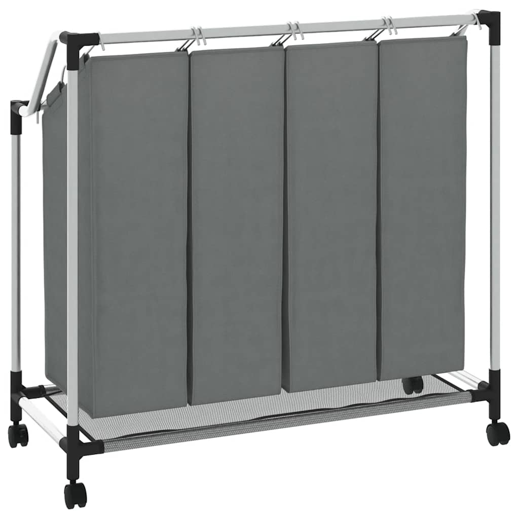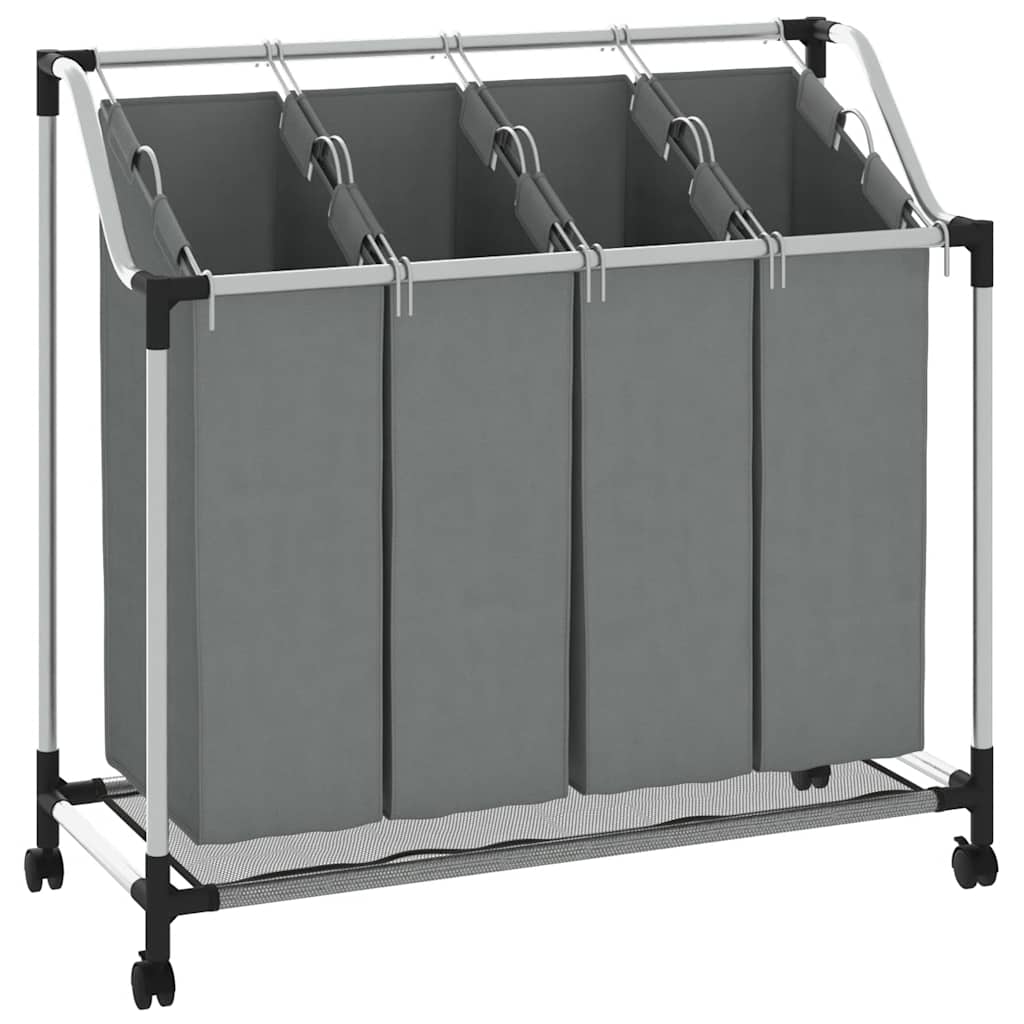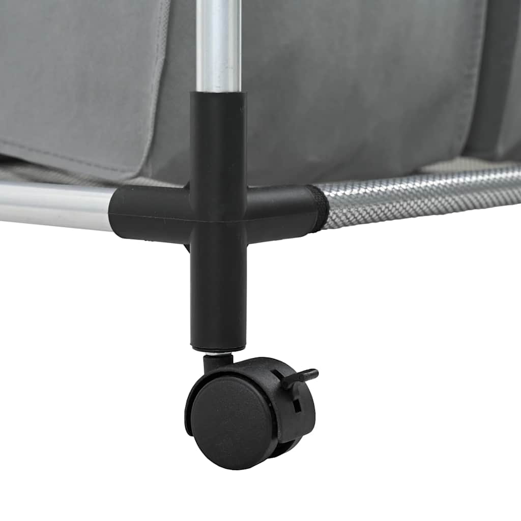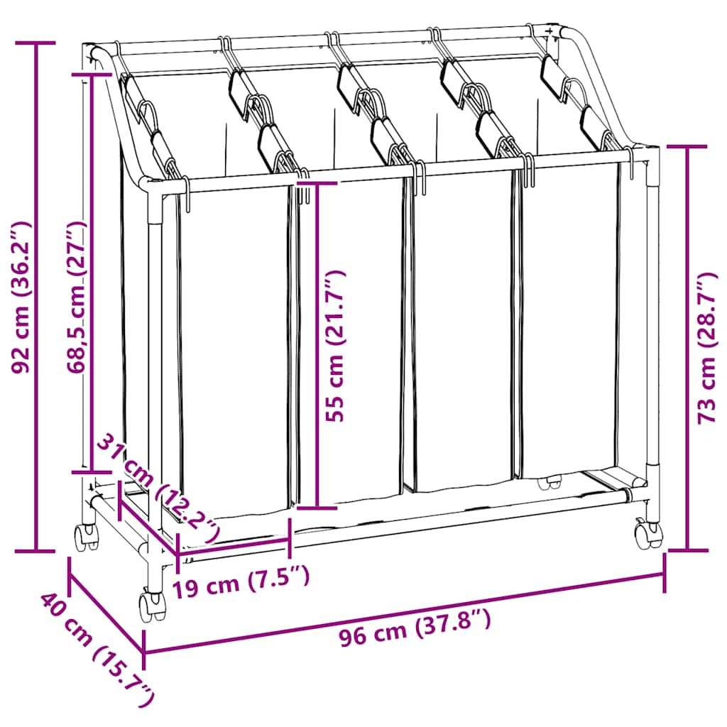 Dieser Wäschekorb mit Rollen ist die ideale Wahl, um deine Wäsche aufzubewahren und zu sortieren, was dein Leben einfacher und bequemer macht. Robuste Struktur: Das Gestell des Wäschekorbs besteht aus Stahl mit einer Kunststoffbeschichtung, was ihn robust, rostfrei und langlebig macht.Reichlich Stauraum: Dieser Wäschekorb verfügt über 4 Wäschesäcke, in denen du deine Wäsche nach Farbe und Material sortiert aufbewahren kannst. Das sorgt für Ordnung und spart dir Zeit.Abnehmbares Design: Der Wäschekorb ist mit Klettverschlüssen ausgestattet, sodass er je nach Bedarf leicht verschoben oder befestigt werden kann. Außerdem sorgen die abnehmbaren oberen Stützstangen für eine flexible Nutzung.Leicht zu bewegen: Dieser Wäschekorb kann mit den vier mitgelieferten Schwenkrollen leicht an den gewünschten Ort bewegt werden. Die beiden Rollen mit Bremsen halten den Korb in Position und sorgen für zusätzliche Stabilität.Erhöhtes Design: Dank seines erhöhten Designs hält dieser Wäschekorb deine Wäsche vom Boden fern, fördert eine bessere Luftzirkulation, um Feuchtigkeitsansammlungen zu vermeiden, und macht sie leichter zugänglich.