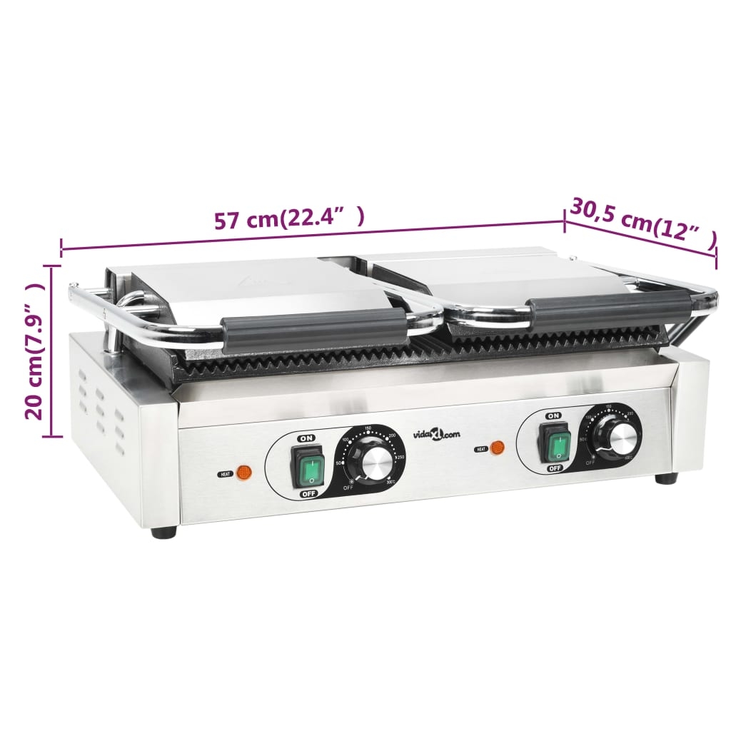 Unser doppelter gerillter Panini-Grill ist die perfekte Wahl, um schnell Panini, Sandwiches, Hamburger, Hähnchen, Gemüse usw. zu grillen. Dieser Kontaktgrill verfügt über ein robustes Edelstahlgehäuse, das ihm ein tolles Aussehen verleiht und ihn langlebig und leicht zu reinigen macht. Die gerillten Gusseisenplatten sorgen für gleichmäßige Wärmeverteilung und schnelles Grillen. Der Grill ist auch mit zwei Temperaturreglern ausgestattet, welche die variablen Heizstufen von niedrig, mittel und hoch bietet. Die Grillplatte hat eine Auffangschale zum Auffangen von überschüssigem Öl, die zur Reinigung leicht entfernt werden kann. Eine Reinigungsbürste ist ebenfalls im Lieferumfang enthalten.