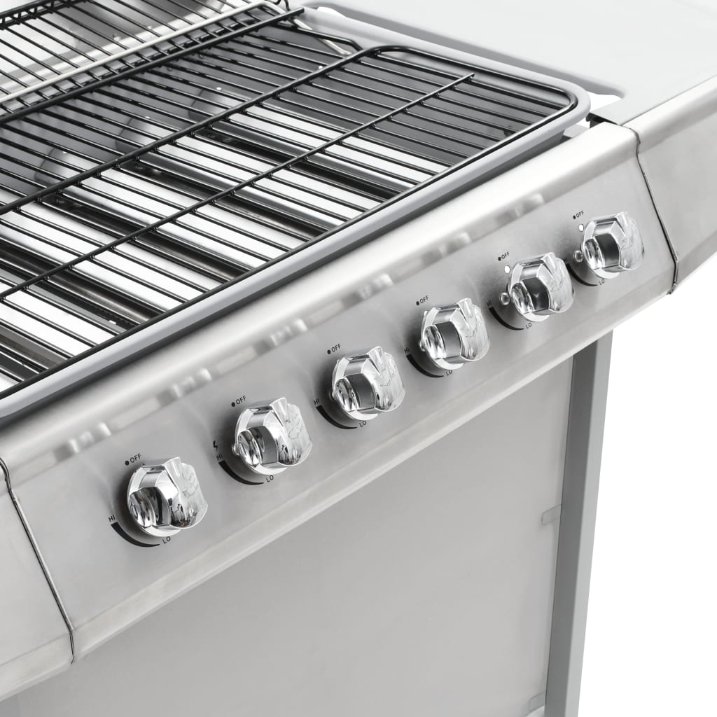 Dieser Gasgrill verfügt über 6 große Kochzonen, was ihn zu einer idealen Wahl für ein Festmahl im Freien mit Familie und Freunden macht. Er verwandelt dich in einen echten Grillmeister und deinen Hinterhof in eine zweite Küche! Der Gasgrill zeichnet sich durch ein stilvolles und praktisches Design aus. Er verfügt über 6 Flammen und eine robuste Haube mit eingebautem Thermometer, das die Grilltemperatur genau anzeigt. Die seitlichen Ablagen bieten zusätzlichen Platz für die Zubereitung von Saucen und Lieblingsbeilagen. Im Lieferumfang ist auch eine abnehmbare Fettauffangwanne enthalten, die sich ganz einfach reinigen lässt. Aus strapazierfähigen Materialien gefertigt, ist der Grill auf eine lange Lebensdauer ausgelegt. Der Unterschrank bietet reichlich Stauraum für Grillutensilien. Dank der 2 robusten Rollen lässt sich der Grill auch mühelos umher verschieben. Zum Anschluss des Grills an eine Gasflasche sind ein Gasschlauch und ein Druckregler erforderlich, die nicht im Lieferumfang enthalten sind.