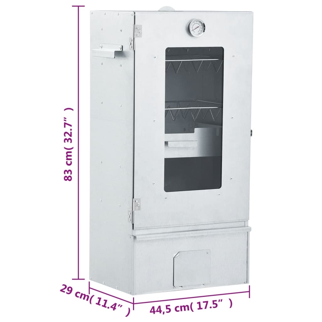 Mit diesem multifunktionalen Räucherofen mit Holzspänen und Kaltrauchgenerator kannst du ein Festmahl zubereiten und eine gemütliche Zeit im Freien mit deiner Familie genießen! Langlebiges Material: Stahl ist ein außergewöhnlich hartes und starkes Material. Er bietet Robustheit und Stabilität. Die Verzinkung bietet einen besseren Schutz gegen Rost und ist für Produkte geeignet, die im Freien verwendet werden.Viel Platz zum Räuchern: Der Outdoor-Smoker bietet viel Platz zum Räuchern von Fleisch, Fisch, Würstchen und mehr. Die mitgelieferten S-förmigen Haken und Roste erleichtern die Zubereitung der Speisen.Mit Thermometer: Der Räucherofen ist mit einem Thermometer ausgestattet, um die Kammertemperatur zu überprüfen. Dank des Glasfensters kannst du zudem das Grillgut im Inneren im Auge behalten, um die besten Grillergebnisse zu erzielen.Kaltrauchgenerator: Fülle ihn einfach mit Sägemehl und zünde ihn mit einem Teelicht an, bis das Sägemehl anfängt, seine Farbe zu wechseln. Danach kann das Teelicht entfernt und der Kaltraucherzeuger in den Räucherschrank gelegt werden. Dank des kompakten Gitters in rechteckiger Form brennen die Räucherspäne für bis zu 20 Stunden gleichmäßig und langsam ab. Achtung:Der Grill darf nicht in geschlossenen und/oder bewohnbaren Bereichen wie Häusern, Zelten, Wohnwagen, Wohnmobilen und Booten verwendet werden. Ansonsten besteht die Gefahr einer Kohlenmonoxidvergiftung, die zum Tod führen kann.
