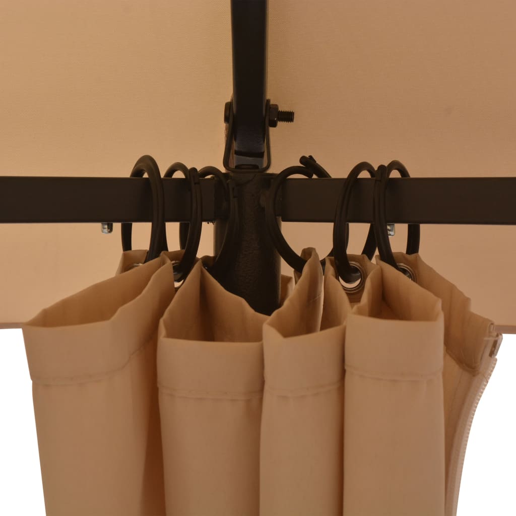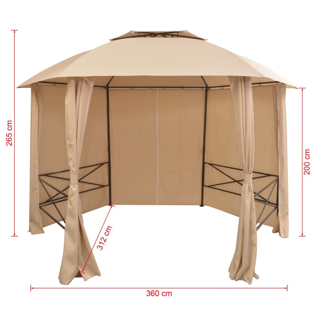 Dieser Pavillon mit Vorhängen hat ein klassisches, elegantes Design. Er ist der perfekte Sonnenschutz für Veranstaltungen im Freien, wie zum Beispiel Abendessen, BBQs, Familienfeiern usw.. Das wasserbeständige Dach und die Vorhänge bestehen aus Polyestergewebe mit einer Beschichtung aus Polyamid (PA). Der Rahmen ist aus robustem, pulverbeschichtetem Stahl gefertigt und somit rostbeständig und sehr stabil. Die Überdachung verfügt über ein stilvolles, doppelt belüftetes Design, das für eine bessere Entlüftung sorgt. Die leicht zu reinigenden Polyestervorhänge können für mehr Privatsphäre geschlossen, oder mit den mitgelieferten Raffhalterungen zurück gesteckt werden. Dieser Pavillon ist die perfekte Wahl für Ihre Feiern im Freien. Die Montage ist sehr einfach. Hinweis: Dieser Artikel sollte NIEMALS bei rauen Wetterbedingungen, wie starkem Wind, Regenschauer, starkem Schneefall, Sturm, Hagel, usw., genutzt werden.