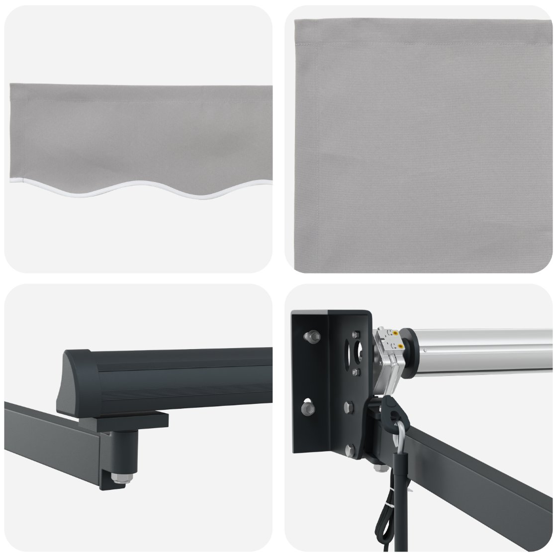 Diese automatische, einziehbare Markise ist eine tolle Möglichkeit, deine Außenbereiche zu genießen und gleichzeitig vor der starken Sonne geschützt zu bleiben. Sie hat ein modernes graues Design, das einen schönen Akzent setzt und ist perfekt für Balkone, Wintergärten oder Sonnensäle. Mit ihrem stabilen Metallrahmen und robustem Polyestergewebe deckt sie eine große Fläche von 350 cm x 250 cm ab, damit du an sonnigen Tagen entspannt relaxen kannst. Verstellbarer Mechanismus: Die Markise hat ein manuelles Einstellsystem, mit dem du den Winkel einfach steuern kannst, um mit den Sonnenlichtbedingungen Schritt zu halten. Das sorgt für Komfort, weil du genau den Schatten hast, den du magst. Wetterfest: Hergestellt aus farbbeständigen, UV-beständigen und wasserabweisenden Materialien, hält diese Markise allen Wetterbedingungen stand und bleibt über den Sommer hinweg in gutem Zustand. Du kannst dich entspannen, weil dein Platz vor schädlichen Sonnenstrahlen geschützt ist. Bequeme Bedienung: Sie ist einfach zu bedienen, mit manuellem Betrieb kannst du die Markise ohne elektrische Hilfe aus- oder einziehen. Das macht es jedem leicht, die Freiluft-Erfahrung zu genießen. Stylisches Aussehen: Das schlanke, moderne Design der Markise passt nicht nur zu ihrem Zweck, sondern sieht auch gut in verschiedenen Außenstilen aus. Ihr elegantes, dezentes Design trägt zum Charme deiner Außenbereiche bei. Einfache Reinigung: Damit sie frisch aussieht, einfach mit einem feuchten Tuch abwischen. Regelmäßige Pflege erhält ihr lebendiges Aussehen lange.