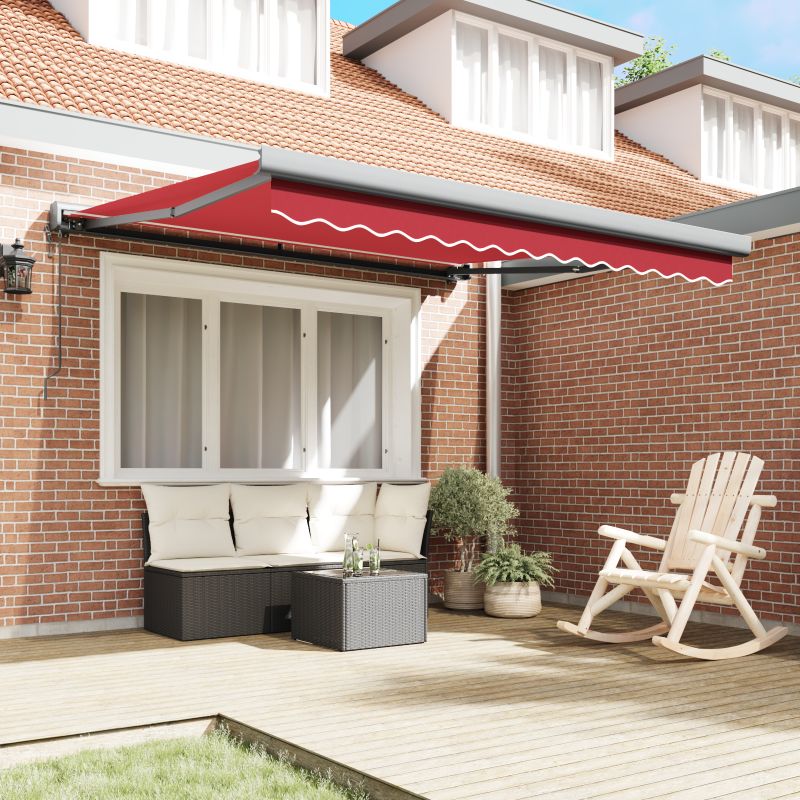 Gestalte deinen Außenbereich mit der Automatischen einziehbaren Markise, perfekt für Schatten und Komfort auf deinem Balkon. Diese schicke Markise hat ein elegantes Design in leuchtendem Rot und Grau und ist eine tolle Ergänzung für deine Gartenmöbel.