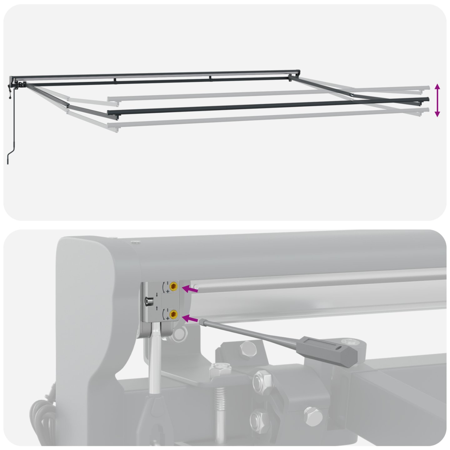 - Achtung! Starke Feder beim Öffnen! Entfernen Sie dieses Seil NICHT, bevor alle Montageschritte (mit allen Schrauben fest angezogen) abgeschlossen sind und der Gegenstand sicher an der Wand angebracht ist! Warnung! Vorsicht beim Lösen der Arme, da diese unter Spannung stehen! Ein plötzliches Lösen des Arms einer Gelenkarmmarkise kann zu Verletzungen führen. Warnung: Die Bedienungsanleitung muss vor der Verwendung des Produkts gelesen werden. Warnung: Der Betrieb unter frostigen Bedingungen kann das Produkt beschädigen. Verwendung im Außenbereich (an Gebäuden und bei Bauarbeiten). Erlaube Kindern nicht, mit der Steuerungsvorrichtung der Jalousie zu spielen. Halte die Fernbedienung von Kindern fern. Kinder sollten beaufsichtigt werden, um sicherzustellen, dass sie nicht mit dem Gerät spielen. Halte Kinder vom Montagebereich fern. Achtung! Lies die Anleitung vor dem Gebrauch sorgfältig durch und bewahre sie zum Nachschlagen auf.