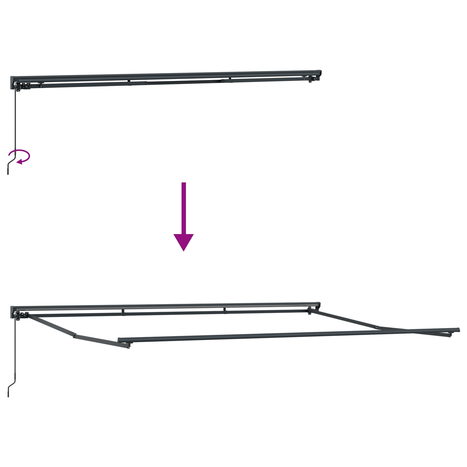 - Achtung! Starke Feder beim Öffnen! Entfernen Sie dieses Seil NICHT, bevor alle Montageschritte (mit allen Schrauben fest angezogen) abgeschlossen sind und der Gegenstand sicher an der Wand angebracht ist! Warnung! Vorsicht beim Lösen der Arme, da diese unter Spannung stehen! Ein plötzliches Lösen des Arms einer Gelenkarmmarkise kann zu Verletzungen führen. Warnung: Die Bedienungsanleitung muss vor der Verwendung des Produkts gelesen werden. Warnung: Der Betrieb unter frostigen Bedingungen kann das Produkt beschädigen. Verwendung im Außenbereich (an Gebäuden und bei Bauarbeiten).Kinder sollten beaufsichtigt werden, um sicherzustellen, dass sie nicht mit dem Gerät spielen. Halte Kinder vom Montagebereich fern. Achtung! Lies die Anleitung vor dem Gebrauch sorgfältig durch und bewahre sie zum Nachschlagen auf.