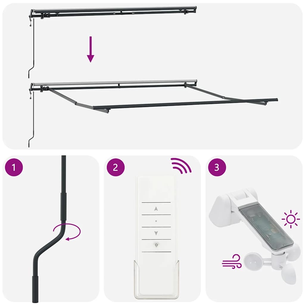 Schaffe einen angenehmen, kühlen Platz auf deiner Terrasse und schütze dich vor UV-Strahlen mit dieser Markise! Langlebiges Material: Der Markisenrahmen ist aus pulverbeschichtetem Aluminium gefertigt, welches Robustheit und Langlebigkeit gewährleistet. Dank PU-Behandlung ist der Markisenstoff UV-beständig. Diese Markise schützt deine Familie und Gäste vor UV-Strahlen und grellem Sonnenlicht.Automatische Funktion: Mit der mitgelieferten Fernbedienung kannst du die Markise ganz einfach ein- und ausfahrenEinfach zu bedienen: Der Winkel und die Höhe können an deine unterschiedlichen Bedürfnisse angepasst werden. Du kannst diese Markise mittels der langen Kurbel leicht ein- und ausfahren.Vielfältige Einsatzmöglichkeiten: Die Markise mit Kurbel zeichnet sich durch ein einfaches und stilvolles Design aus, das sich gut auf deiner Terrasse oder vor Bistros einfügen wird. Der Sonnenschutz eignet sich für eine Vielzahl von Orten, wie Balkone, Terrassen, Höfe, Restaurants, Cafés, Geschäfte und mehr.
