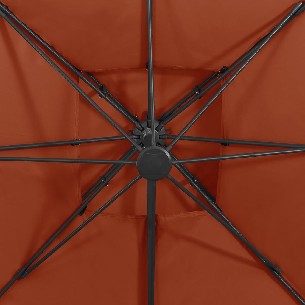 Dieser Sonnenschirm spendet Schatten und bietet auch Schutz gegen schädliche UV-Strahlen. Aus UV-beständigem und farbechtem Polyester gefertigt, bietet dieser pflegeleichte Sonnenschirm optimalen Schutz vor schädlichen Sonnenstrahlen. Er verfügt über einen stabilen Kreuzständer, der für erhöhte Stabilität sorgt. Das exklusive Design dieses Gartenschirms ermöglicht es, ihn um 360 Grad zu neigen und zu drehen, um den Sonnenschutz immer in der gewünschten Position einzustellen. Der starke Alumast macht den Sonnenschirm zusammen mit den 8 Speichen sehr stabil und langlebig. Zudem lässt sich der Gartenschirm dank des Kurbelmechanismus leicht öffnen und schließen. Darüber hinaus unterstützt das Doppeldach-Design die Lüftung des Ampelschirms. Bitte beachten: Wir empfehlen, die Schirmbespannung mit einem Imprägnierspray zu behandeln, wenn es starken Regenfällen ausgesetzt ist.