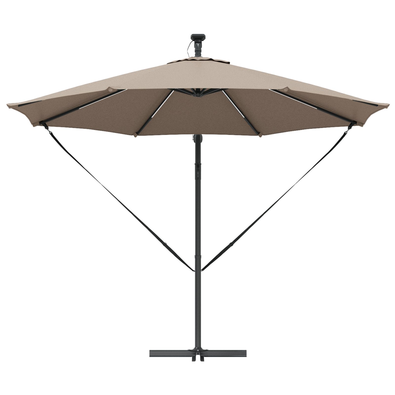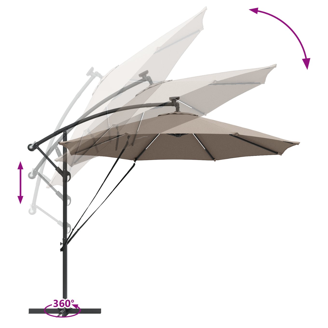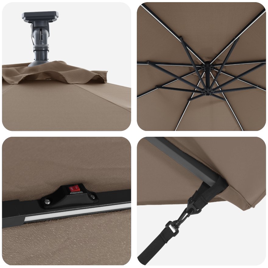 Dieser freistehende Sonnenschirm sorgt für eine stylische Atmosphäre in Außenbereichen wie Balkonen, Gärten und Terrassen. Er erhöht den Komfort und den Schutz an sonnigen Tagen mit seinem schlichten Design, der glatten Oberfläche und dem pulverbeschichteten Finish sowie einem UV-schutzbeschichteten Polyesterbezug. Wenn du auf Stil und Funktion Wert legst, ist dieser Schirm die perfekte Wahl. Stell dir vor, wie du gemütlich mit Freunden unter diesem großen Schattenspender sitzt, der jeden Bereich in etwas Besonderes verwandelt. Verstellbare Handkurbel: Dank der stylischen Handkurbel kannst du den Sonnenschirm ganz leicht öffnen und schließen. So kannst du die Höhe einstellen und genau den richtigen Schatten genießen, was dein Sitzen oder Essen im Freien viel angenehmer macht. Neigungssystem: Mit der eingebauten Neigungsfunktion kannst du den Schirm einfach anpassen, um optimalen Sonnenschutz zu erhalten. Dieses praktische Feature hilft dir, die Sonne aus den Augen zu halten, egal ob bei geselligen Treffen, beim Familienessen oder einfach nur zum Entspannen. LED-Beleuchtung: Die LED-Lichter an den Streben beleuchten deinen Außenbereich in der Nacht und sorgen für eine gemütliche Stimmung. Sie sind umweltfreundlich und energieeffizient, da sie mit Solarenergie betrieben werden, sodass du deine Abendausflüge genauso genießen kannst wie die am Tag. Pulverbeschichteter Stahl: Der Schirm hat einen stabilen Rahmen aus pulverbeschichtetem Stahl, der für die Ewigkeit gemacht ist. Die Beschichtung ist rost- und kratzfest, damit er bei jedem Wetter gut aussieht. Wasserabweisender Stoff: Der Polyesterbezug ist langlebig und wasserabweisend, sodass du trocken bleibst, selbst wenn plötzlich ein paar Tropfen fallen. So sieht der Schirm frisch aus und schützt deinen Sitzbereich.