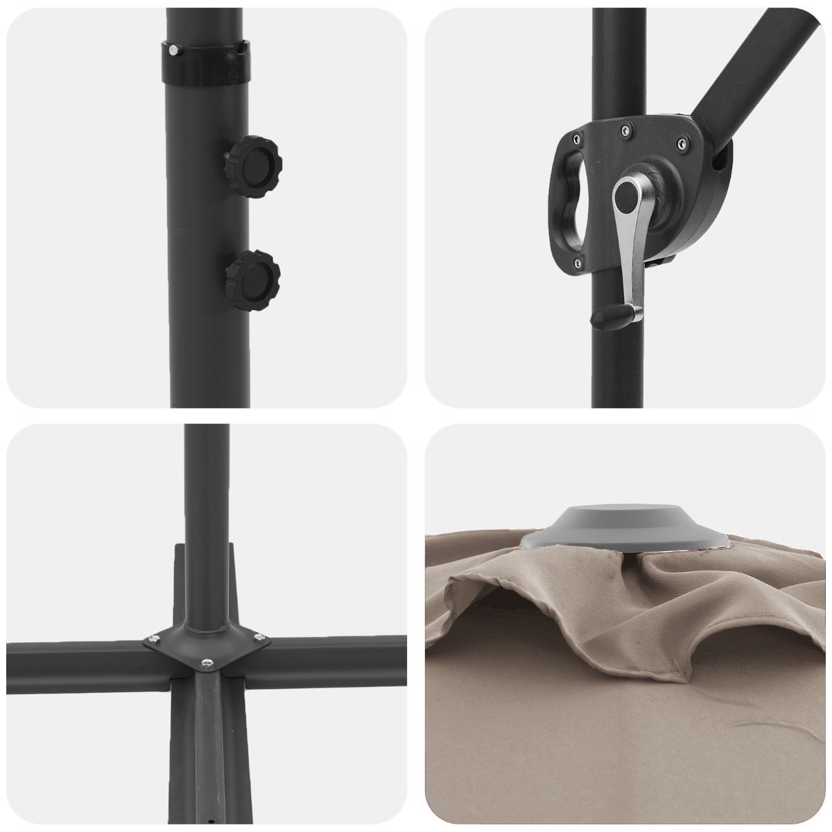 Dieser freischwingende Sonnenschirm verwandelt dein Outdoor-Erlebnis mit seinen smarten Funktionen und seinem stylischen Design. Er ist langlebig und sieht dabei gut aus, bietet dir viel Schatten und ist ein Must-Have für Balkone, Gärten und Terrassen – besonders im Sommer. Sein modernes Design und die verstellbare Konstruktion machen es möglich, das ganze Jahr über draußen zu entspannen. Verriegelungsmechanismus: Dieses smarte Sicherheitsmerkmal hält den Schirm sicher, wenn er geöffnet ist, und verhindert, dass er durch Wind oder Stöße zufällt. Entspanne dich, denn er bleibt auch bei leichtem Wind sicher stehen, selbst wenn Kinder darunter spielen. Einfacher Handkurbel: Mit einer einfachen Handkurbel lässt sich der Schirm problemlos öffnen und schließen. Es ist super einfach für die ganze Familie, egal ob Teenager oder Großeltern, und macht es leicht, deinen Schatten zu managen. Kippfunktion: Mit der Kippfunktion kannst du den Schirm perfekt für Schatten anpassen, während sich die Sonne bewegt. Ideal zum Lesen, für Mittagessen im Freien oder einfach nur zum Entspannen – egal, wo die Sonne steht, du bist gut abgedeckt. UV-Schutz: Hergestellt aus UV-beständigen, pulverbeschichteten Materialien, hält dieser Schirm der Sonne stand, ohne auszubleichen und verspricht eine lange Lebensdauer. Der wasserabweisende Stoff lässt leichten Regen abprallen, sodass du weiterhin viel Zeit im Freien genießen kannst, selbst wenn das Wetter mal nicht mitspielt. Pflege & Wartung: Damit dein Schirm gut aussieht und lange hält, benutze ein wasserfestes Spray für extra Schutz und eine Abdeckung, wenn du ihn nicht benutzt. Vermeide aggressive Reiniger, damit er über die Jahre hinweg auffällig und zuverlässig bleibt.