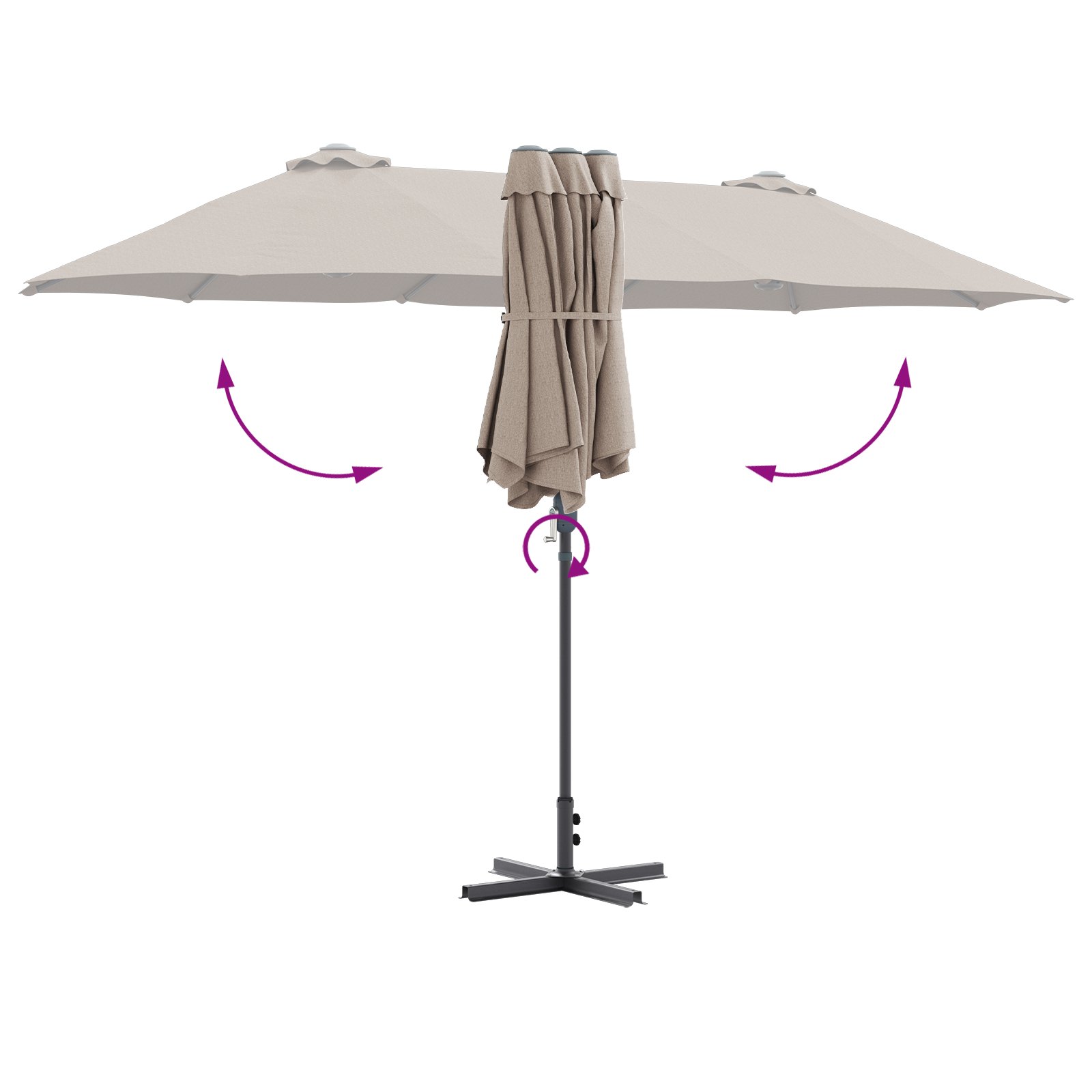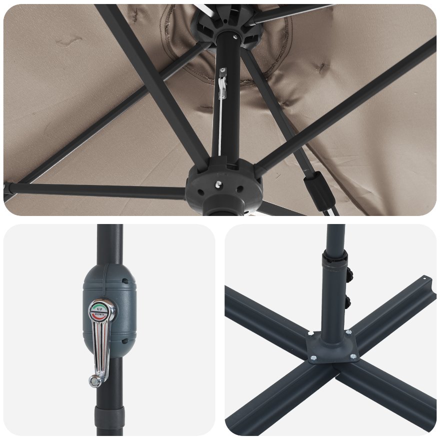 Dieser Terrassenparasols macht deinen Außenbereich besser. Er ist praktisch und passt perfekt auf Balkone, in Gärten oder auf Terrassen. Mit seinem modernen, schlichten Stil und geraden Linien ist er sowohl für schicke Essen im Freien als auch für entspannte Momente perfekt. Top-Material: Der Schirm ist aus pulverbeschichtetem Stahl und hält allem Wetter stand. Das Polyester-Dach ist toll, denn es bleibt trocken, wenn es mal regnet, und sieht den ganzen Sommer über schick aus. Praktische Funktionen: Mit dem drehbaren Kurbelgriff lässt sich der Schirm easy zusammenfalten und verstauen. Die Belüftung sorgt zudem dafür, dass es angenehm kühl bleibt. Einfach zu bedienen: Der Kurbelgriff macht das Öffnen und Schließen super easy, sodass jeder ihn nutzen kann. Von der Sonne in den Schatten zu wechseln, ist ein Kinderspiel. Ideal für: Dieser Schirm ist perfekt für Gärten, Balkone und Terrassen und schafft eine gemütliche Atmosphäre bei Treffen oder einfach beim Relaxen im Freien. Sein großer Schatten bietet Platz für viele Gelegenheiten, von großen Höfen bis zu kleinen Stadtbalkonen. Pflegehinweise: Um ihn länger gut zu halten, benutze eine Abdeckung, wenn er nicht gebraucht wird. Behandle das Material mit einem wasserfesten Spray, um die Wasserbeständigkeit zu erhöhen. Und versuche, ihn bei extremer Hitze nicht draußen stehen zu lassen, um ihn in Schuss zu halten.
