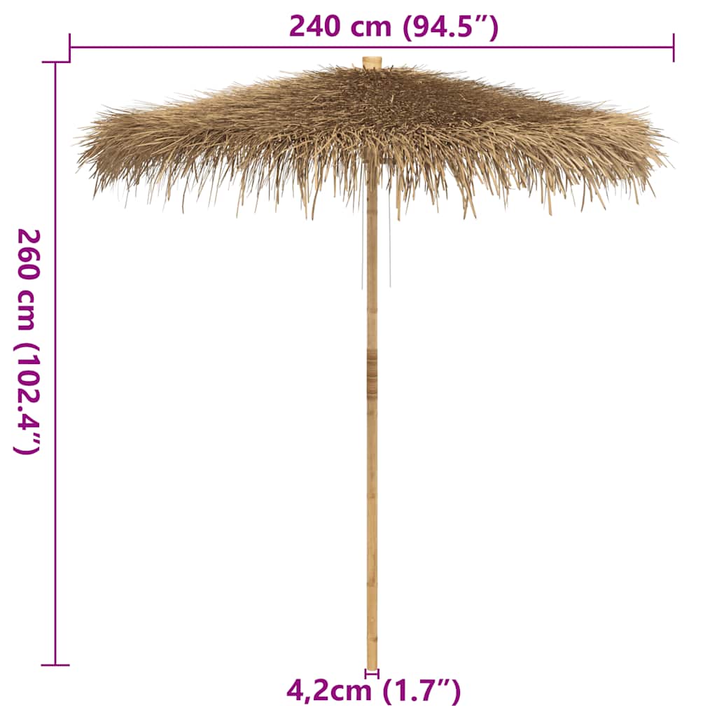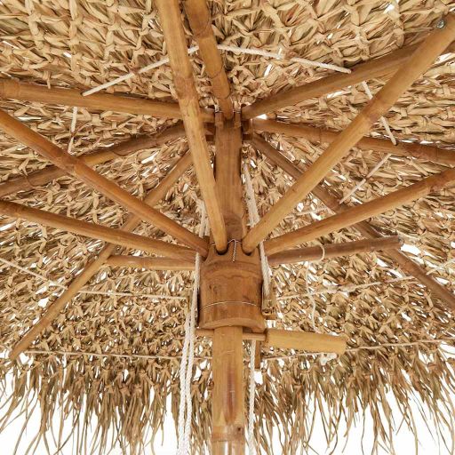 Dieser Tiki-Schirm ist mit einem Bananenblattdach ausgestattet und eignet sich perfekt als Schattenspender im Freien und verleiht deinem Außenbereich tropischen Glanz. Langlebige Materialien: Hergestellt aus natürlichem Bambus und Bananenblatt für Langlebigkeit, blockiert dieser Sonnenschirm UV-Strahlen und spendet Schatten für lang anhaltenden Komfort im Freien.Robuste Konstruktion: Dieser Gartenschirm wird von einer robusten Stange und Rippen getragen, sodass er auch an windigen Tagen an Ort und Stelle bleibt.Einfach zu bedienen: Mit seinem manuellen Seilzugsystem lässt sich dieser Gartenschirm einfach öffnen und schließen. Setze ihn direkt in einen Tisch mit Schirmloch ein oder kombiniere ihn mit einem geeigneten Standfuß (nicht im Lieferumfang enthalten) für eine stabile Nutzung.Breite Anwendungen: Dieser Sonnenschirm im hawaiianischen Stil ist langlebig und stilvoll und passt in jeden Außenbereich wie Terrasse, Garten, Strand, Pool usw. und kann sogar als Dekoration für Themenbars und Cafés verwendet werden. Gut zu wissen:Das Dach des Schirms ist handgeflochten und spendet einen Teil des Schattens, blockiert aber nicht 100 % der Sonneneinstrahlung.