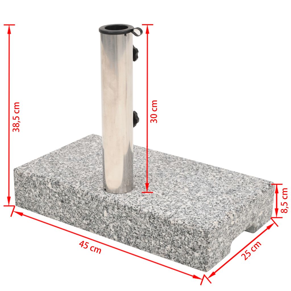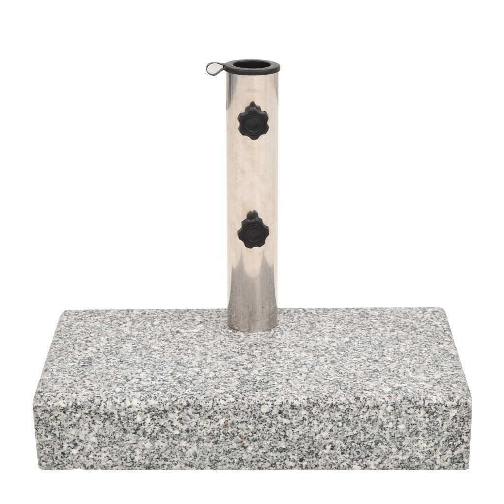 Dieser solide Sonnenschirmständer aus Granit bietet eine festen und robusten Stand für Ihren Sonnenschirm und bewahrt ihn so vor dem Umkippen oder starkem Wind. Der Schirmfuß besteht aus einer robusten Granitkonstruktion, die dank ihres hohen Gewichts sehr stabil ist. Das Granit sorgt für ein ästhetisches Aussehen und modernes Feeling und verleiht dem gesamten Schirm so eine elegante Erscheinung, und Ihrem Outdoor-Wohnraum einen Hauch von Eleganz. Ergänzen Sie Ihre luxuriösen Gartenmöbel durch diesen Granitfuß mit Edelstahlrohr. Die mitgelieferten 2 Adapter passen zu Sonnenschirmstangen mit einem Durchmesser von 38 mm oder 48 mm. Die Befestigung des Sonnenschirms an dem Fuß ist ein Kinderspiel und ihr Sonnenschirm steht fortan kerzengerade.