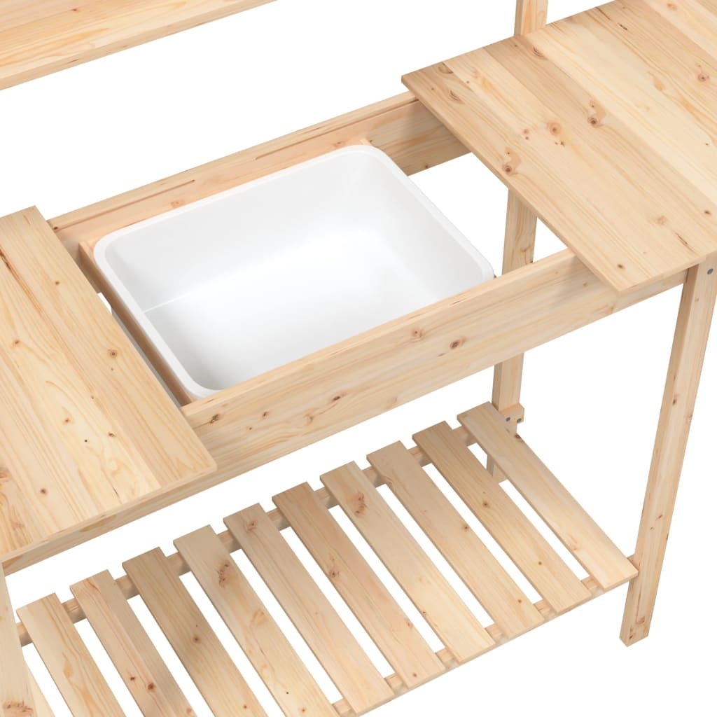 Dieser Pflanztisch aus Holz eignet sich perfekt, um deine Topfpflanzen in den eigenen vier Wänden, im Garten, auf der Terrasse oder im Hinterhof ordentlich aufzubewahren und zur Schau zu stellen. Tannen-Massivholz: Der Pflanztisch ist aus massivem Tannenholz gefertigt, das für Robustheit und Stabilität sorgt. Massives Tannenholz ist ein schönes und widerstandsfähiges Material, das feuchtigkeitsbeständig bleibt. Dieses Massivholz trocknet nicht aus und verzieht sich nicht, was es zu einer zuverlässigen Wahl macht.Viel Stauraum: Die Pflanztisch ist mit 2 oberen Ablagen, einer unteren Ablage und Metallhaken an der Seite versehen. Der Tisch bietet dadurch ausreichend Platz für verschiedene Sachen wie Gartengeräte, Erde, Dünger usw.Nützliches Design: Der Gärtnertisch verfügt über eine ausziehbare Tischplatte und ein herausnehmbares Kunststoff-Becken. Du kannst jederzeit auf das Waschbecken zugreifen oder es abdecken und so einen robusten Arbeitsplatz genießen.Gute Belüftung: Die untere Ablage mit Latten-Design verhindert die Ansammlung von Wasser, wodurch das Holz vor Verrottung geschützt ist und die Lebensdauer des Produkts zu verlängert wird.Vielseitig einsetzbar: Die Pflanzstation verleiht jedem Raum einen Hauch Natürlichkeit und ist auch eine perfekte Bereicherung für deinen Innenhof, Garten, Gewächshaus oder Terrasse. Gut zu wissen:Wir empfehlen dir, deine Gartenmöbel mit einer wasserdichten Hülle zu schützen, um lange Zeit eine ansprechende Optik aufzuweisen.