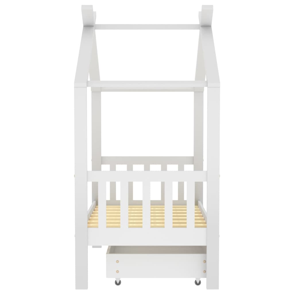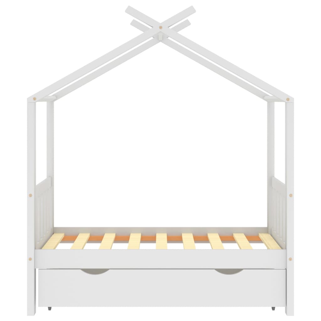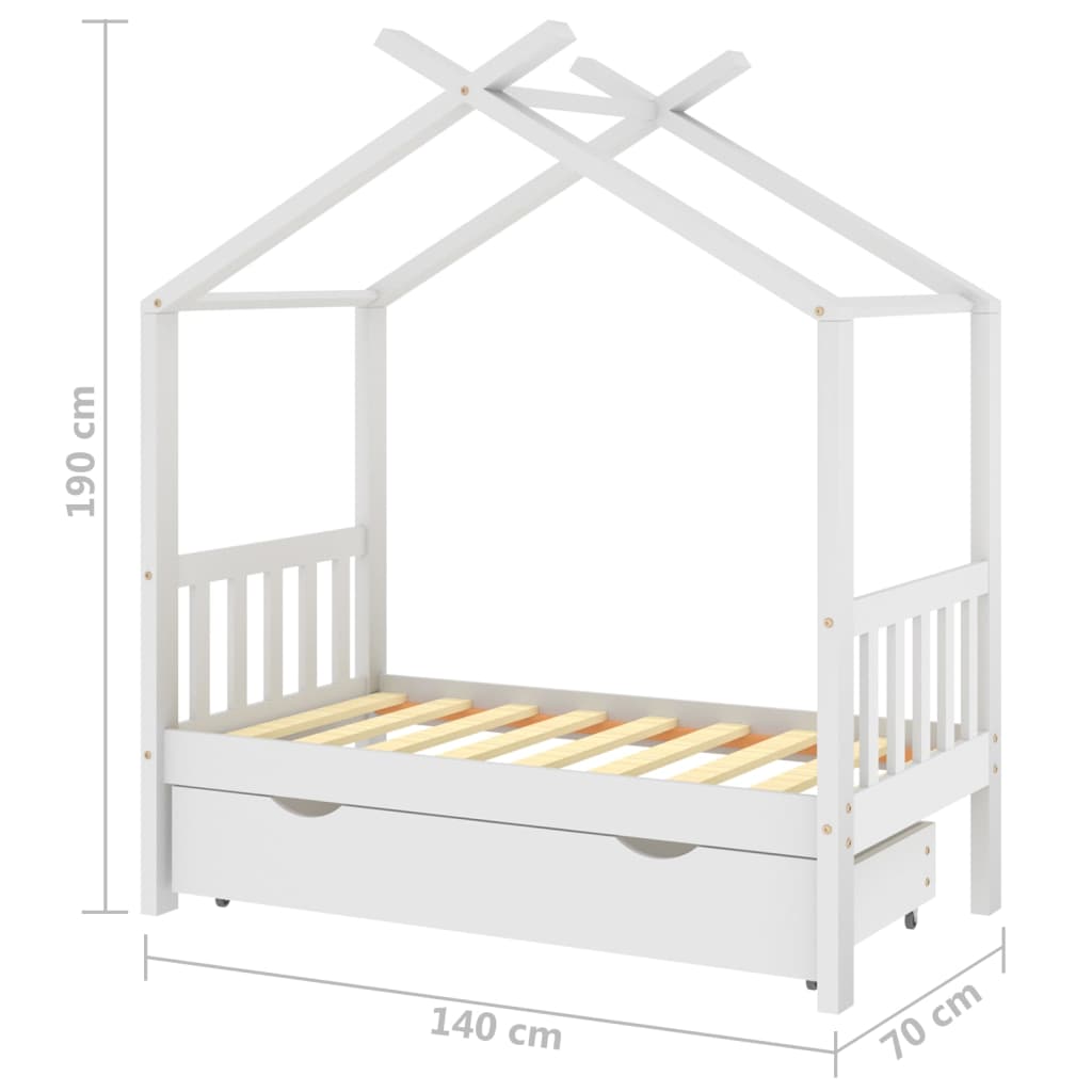 Dieses Massivholz-Kinderbett mit einer Schublade ist eine praktische und dekorative Bereicherung für jedes Kinderzimmer. Das Holzbett für Kinder ist mit einem Bettrahmen im Baumhaus-Stil ausgestattet, an dem Bettvorhänge angebracht werden können. So kann dieses Betthaus mehr Privatsphäre für Kinder bieten. Mit dem passenden Zubehör kann es auch als Spielhaus dienen. Das aus massivem Kiefernholz gefertigte Bett ist äußerst stabil und langlebig. Die starken Latten bieten den nötigen Halt und Komfort. Die mitgelieferte Bettschublade mit 2 Griffen bietet reichlich Stauraum für Kleidung, Spielzeug, Bettwäsche usw. und hält das Kinderzimmer sauber und aufgeräumt. Die leichtgängigen Rollen laufen sowohl auf Teppichböden als auch auf Holzböden reibungslos. Dieses Bettgestell ist für eine Matratze von 70 x 140 cm ausgelegt. Bitte beachten: Die Lieferung umfasst nur das Bettgestell; Matratze und Vorhänge sind nicht im Lieferumfang enthalten. Das Bett ist einfach zu montieren. Eine passende Matratze findest du in unserem Shop.