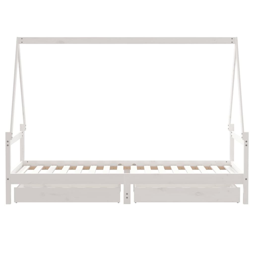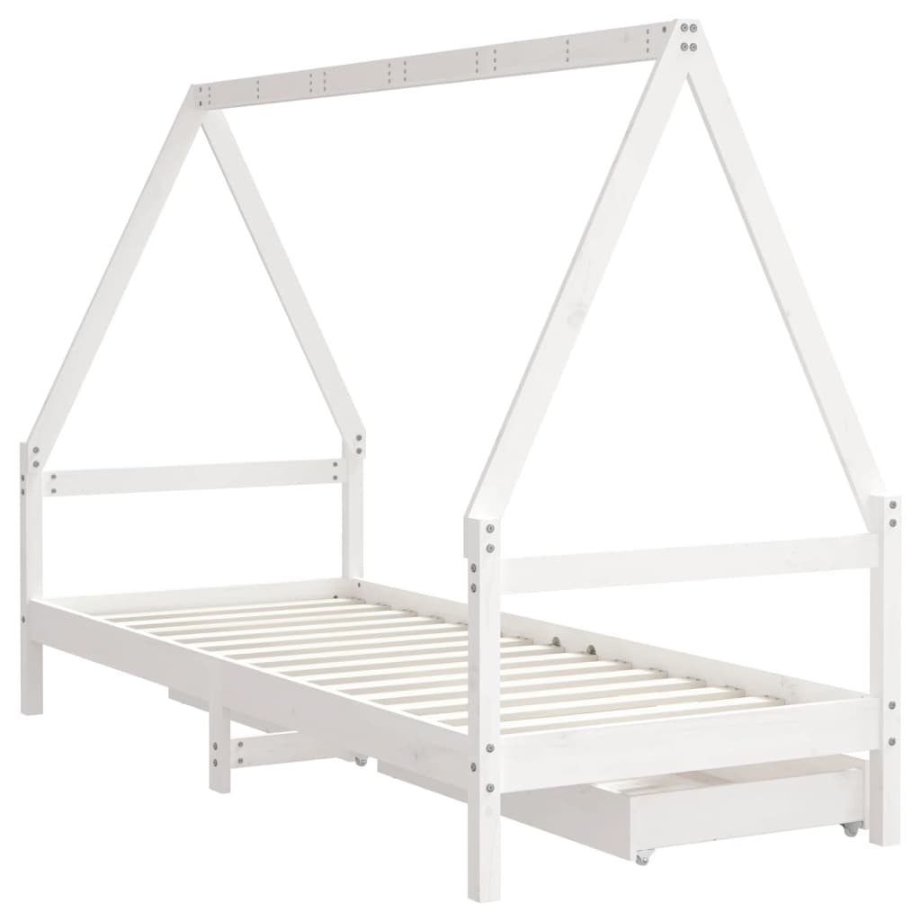 Mit diesem fantastischen Kinderbett aus Holz bietest du deinen Kleinen einen eigenen lustigen Platz! Massives Kiefernholz: Das Kinderbett ist aus massivem Kiefernholz gefertigt. Massives Kiefernholz ist ein wunderschönes Naturmaterial. Kiefernholz weist eine gerade Maserung auf und die Aststellen verleihen dem Material seine charakteristische, rustikale Optik.Robuste Latten: Das Kinderbett ist mit Holzlatten versehen, die für einen festen Halt, Belüftung und Stabilität sorgen.Design in Hausform: Dieses Kleinkinderbett weist ein durchdachtes Design mit einem Rahmen in Hausform auf, an dem du Bettvorhänge aufhängen kannst, um Privatsphäre für dein Kind zu schaffen.Mit Schubladen: Die mitgelieferten Schubladen bieten reichlich Platz für die Aufbewahrung von Kleinspielzeug, Kleidung und Bettzeug, um für Ordnung im Kinderzimmer zu sorgen.Durchdachtes Design: Dank der geringen Höhe des Einzelbettes können Kinder leicht ins Bett ein- und aussteigen.