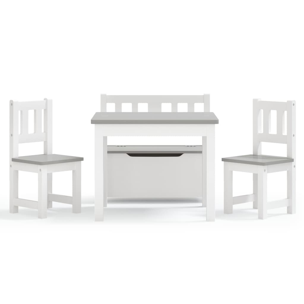 Mit diesem Tisch und Stuhl-Set kann Ihr Kind mit Freunden am Tisch sitzen und malen, basteln, essen oder zusammen spielen. Dieses Set aus Tisch und Stühlen besteht aus langlebigem MDF und ist daher leicht zu reinigen und zu pflegen. Neben dem routinemäßigen Lesen und Schreiben kann der Tisch auch für Puzzles, Brettspiele, Basteln und zum Genießen von Snacks verwendet werden. Die Kinderbank stellt eine perfekte Kombination aus Sitzgelegenheit und Stauraum dar. Dabei bietet die integrierte Truhe mit Deckel den idealen Platz zur ordentlichen Aufbewahrung von Spielzeugen und anderen Sachen. Die Kanten und Ecken des Tisches und der Stühle sind abgerundet, um die Sicherheit der Kinder zu gewährleisten. Das Kindermöbel-Set bietet den Kleinen ein perfektes eigenes Plätzchen und lässt sich in den eigenen vier Wänden aber auch Schulen, Kindergärten usw. einsetzen.