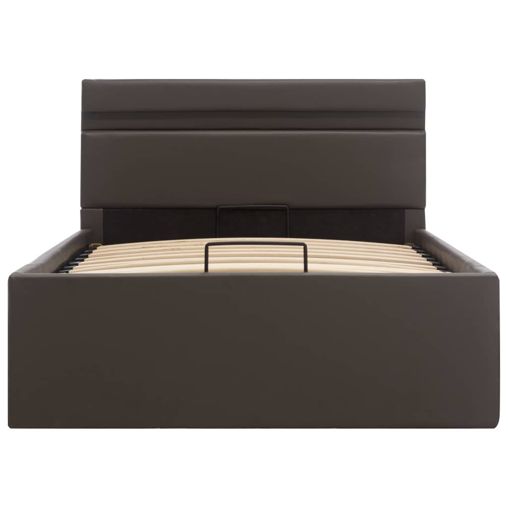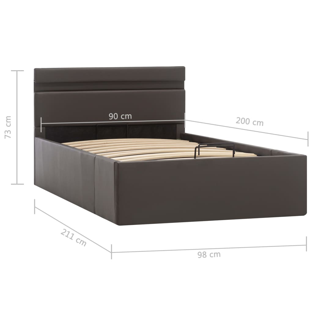 Verleihe deinem Schlafzimmer mit diesem hydraulischen Bettgestell aus Kunstleder sofort ein beeindruckendes und modernes Aussehen! Dieses Einzelbett zeichnet sich durch ein schlichtes und zugleich stilvolles Design sowie einer soliden Konstruktion aus, da es aus starkem und robustem MDF gefertigt ist. Dieses Polsterbett verwandelt den ungenutzten Raum unter der Matratze in einen Stauraum mit viel Platz zur Aufbewahrung von Kleidung, Laken, Decken usw. Der hydraulische Gashebemechanismus macht das Anheben der Matratze zum Kinderspiel. Der Lattenrost steht nach dem Anheben aufrecht, sodass du beide Hände frei hast, um darunter liegende Gegenstände zu entfernen oder zu verstauen. Der pulverbeschichtete Stahlrahmen und die Sperrholzlatten tragen zur Stabilität und Haltbarkeit des Bettes bei. Dieses Stauraumbett ist mit glänzendem Kunstleder bezogen, sieht einladend aus und ist leicht zu pflegen. Dieses Bettgestell ist für eine Matratze von 90 x 200 cm geeignet. Es ist mit LED-Beleuchtung ausgestattet, die sich leicht einstellen lassen, um eine individuelle Lichtshow zu erzeugen. Du kannst die Modi, die Farben und die Helligkeit individuell anpassen, um das Ambiente deines Innenraums zu verbessern. Dieses Produkt ist einfach zu montieren. Bitte beachte, dass im Lieferumfang nur das Bettgestell enthalten ist. Eine Matratze ist nicht im Lieferumfang enthalten. In unserem Shop findest du die passenden Matratzen. Hinweis: Das Produkt verfügt über einen USB-Anschluss, aber die zertifizierte 5-V-USB-Stromquelle ist nicht im Lieferumfang enthalten.