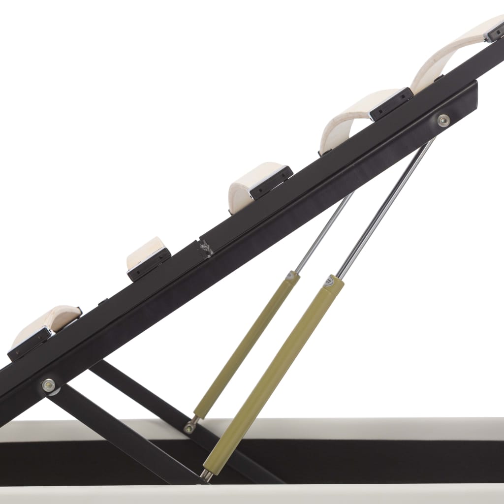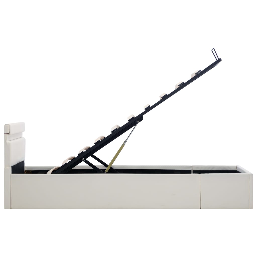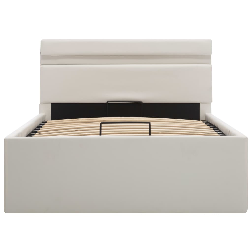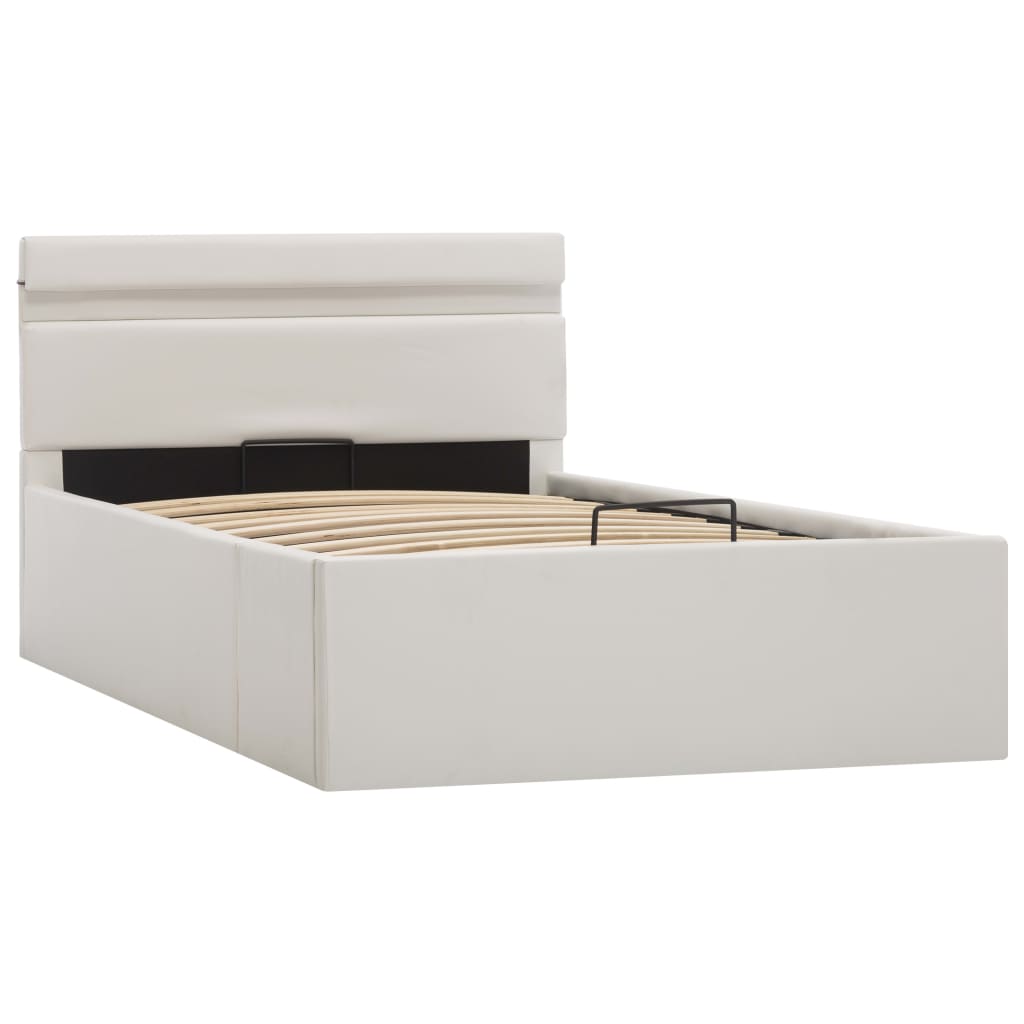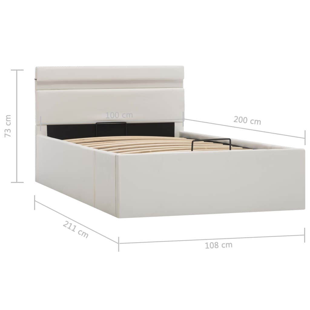 Verleihe deinem Schlafzimmer mit diesem hydraulischen Bettgestell aus Kunstleder sofort ein beeindruckendes und modernes Aussehen! Dieses Einzelbett zeichnet sich durch ein schlichtes und zugleich stilvolles Design sowie einer soliden Konstruktion aus, da es aus starkem und robustem MDF gefertigt ist. Dieses Polsterbett verwandelt den ungenutzten Raum unter der Matratze in einen Stauraum mit viel Platz zur Aufbewahrung von Kleidung, Laken, Decken usw. Der hydraulische Gashebemechanismus macht das Anheben der Matratze zum Kinderspiel. Der Lattenrost steht nach dem Anheben aufrecht, sodass du beide Hände frei hast, um darunter liegende Gegenstände zu entfernen oder zu verstauen. Der pulverbeschichtete Stahlrahmen und die Sperrholzlatten tragen zur Stabilität und Haltbarkeit des Bettes bei. Dieses Stauraumbett ist mit glänzendem Kunstleder bezogen, sieht einladend aus und ist leicht zu pflegen. Dieses Bettgestell ist für eine Matratze von 100 x 200 cm geeignet. Es ist mit LED-Beleuchtung ausgestattet, die sich leicht einstellen lassen, um eine individuelle Lichtshow zu erzeugen. Du kannst die Modi, die Farben und die Helligkeit individuell anpassen, um das Ambiente deines Innenraums zu verbessern. Dieses Produkt ist einfach zu montieren. Bitte beachte, dass im Lieferumfang nur das Bettgestell enthalten ist. Eine Matratze ist nicht im Lieferumfang enthalten. In unserem Shop findest du die passenden Matratzen. Hinweis: Das Produkt verfügt über einen USB-Anschluss, aber die zertifizierte 5-V-USB-Stromquelle ist nicht im Lieferumfang enthalten.