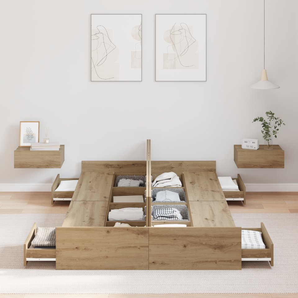 Dieses stylishe Stauraumbett ist genau das, was du für ein modernes Schlafzimmer brauchst. Es bietet sowohl praktischen Nutzen als auch tollen Stil. Der Rahmen hat ein schlichtes und sauberes Design, das perfekt zu verschiedenen Einrichtungsstilen passt. Der integrierte Stauraum ist einfach genial, um alles organisiert zu halten – perfekt für alle, die Einfachheit und Bequemlichkeit schätzen. Vielseitiges Design: Dieses rechteckige Bettgestell verbindet schickes Design mit praktischem Stauraum. Die klaren Linien und die saubere Eleganz passen super in moderne Umgebungen. Der Holzwerkstoff sorgt für einen coolen Look, der zu jedem Schlafzimmerstil passt. Integrierter Stauraum: Mit vielen Schubladen unter der Matratze ist dieses Bettgestell perfekt, um den Stauraum im Schlafzimmer clever auszunutzen. Diese Schubladen sind ideal, um Kleidung, Bettwäsche und andere wichtige Sachen zu verstauen, sodass der Platz effizient genutzt wird, ohne dass der Stil leidet. Robuste Konstruktion: Aus solidem Holzwerkstoff gefertigt ist dieses Stauraumbett stabil und langlebig. Es bietet dir eine große Stabilität für einen angenehmen Schlaf. Das Kopf- und Fußteil sorgt zusätzlich für Halt. Praktische Funktionen: Du brauchst keinen Boxspring, was die Nutzung super einfach macht. Es hat starke Latten für einen stabilen Matratzenhalt und die hochklappbare Basis verbirgt Stauraum, was die Flexibilität erhöht. Einfache Pflege: Dieses Stauraumbett zu reinigen ist ein Kinderspiel – einfach schnell mit einem feuchten Tuch abwischen. Es ist pflegeleicht und damit die beste Wahl für einen vollen Alltag, da es Bequemlichkeit und Langlebigkeit kombiniert.
