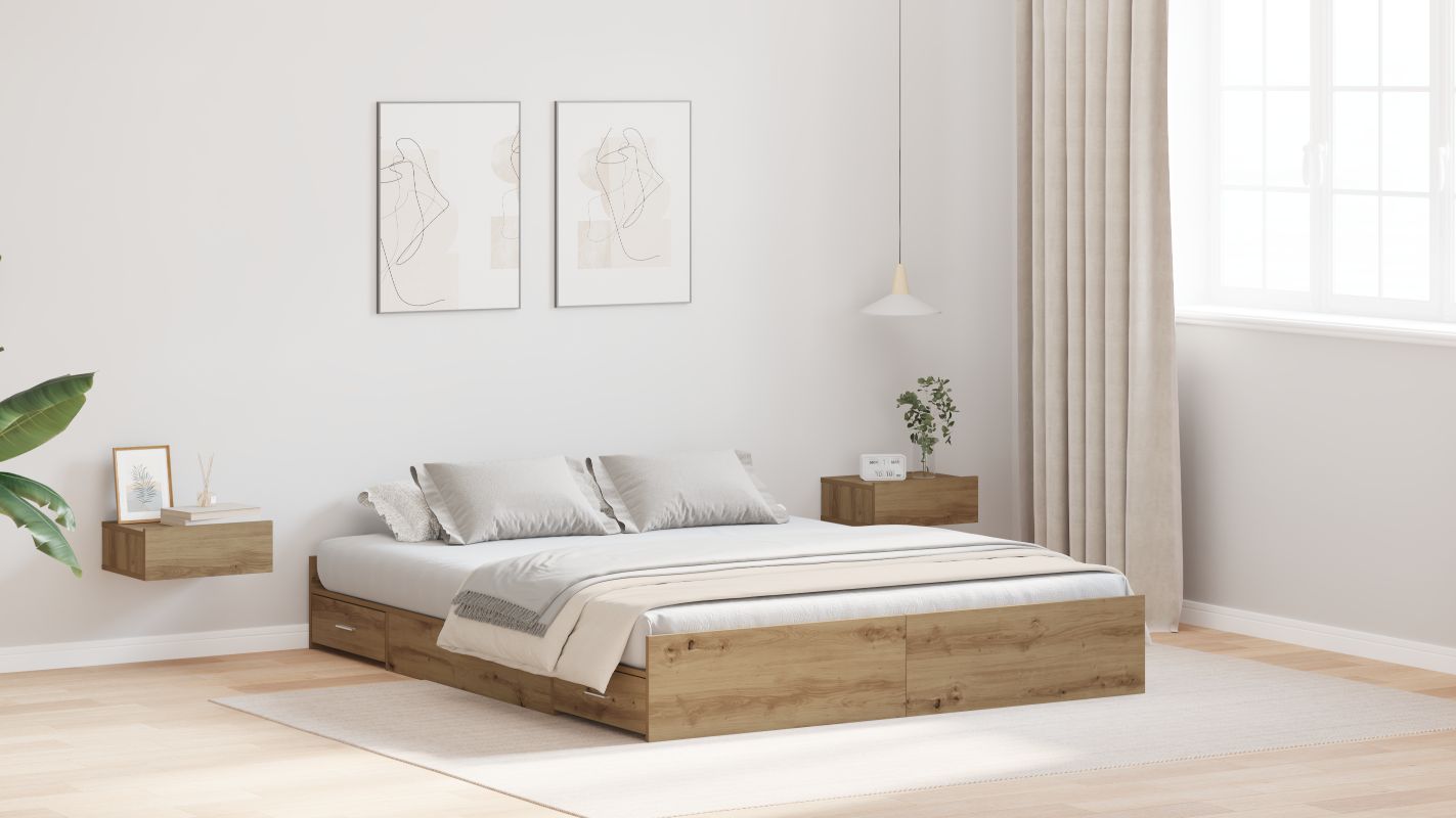 Dieses stylishe Stauraumbett ist genau das, was du für ein modernes Schlafzimmer brauchst. Es bietet sowohl praktischen Nutzen als auch tollen Stil. Der Rahmen hat ein schlichtes und sauberes Design, das perfekt zu verschiedenen Einrichtungsstilen passt. Der integrierte Stauraum ist einfach genial, um alles organisiert zu halten – perfekt für alle, die Einfachheit und Bequemlichkeit schätzen. Vielseitiges Design: Dieses rechteckige Bettgestell verbindet schickes Design mit praktischem Stauraum. Die klaren Linien und die saubere Eleganz passen super in moderne Umgebungen. Der Holzwerkstoff sorgt für einen coolen Look, der zu jedem Schlafzimmerstil passt. Integrierter Stauraum: Mit vielen Schubladen unter der Matratze ist dieses Bettgestell perfekt, um den Stauraum im Schlafzimmer clever auszunutzen. Diese Schubladen sind ideal, um Kleidung, Bettwäsche und andere wichtige Sachen zu verstauen, sodass der Platz effizient genutzt wird, ohne dass der Stil leidet. Robuste Konstruktion: Aus solidem Holzwerkstoff gefertigt ist dieses Stauraumbett stabil und langlebig. Es bietet dir eine große Stabilität für einen angenehmen Schlaf. Das Kopf- und Fußteil sorgt zusätzlich für Halt. Praktische Funktionen: Du brauchst keinen Boxspring, was die Nutzung super einfach macht. Es hat starke Latten für einen stabilen Matratzenhalt und die hochklappbare Basis verbirgt Stauraum, was die Flexibilität erhöht. Einfache Pflege: Dieses Stauraumbett zu reinigen ist ein Kinderspiel – einfach schnell mit einem feuchten Tuch abwischen. Es ist pflegeleicht und damit die beste Wahl für einen vollen Alltag, da es Bequemlichkeit und Langlebigkeit kombiniert.