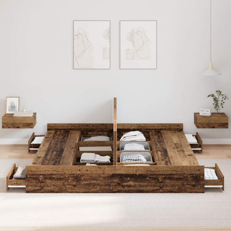 Dieses stylishe Stauraumbett ist genau das, was du für ein modernes Schlafzimmer brauchst. Es bietet sowohl praktischen Nutzen als auch tollen Stil. Der Rahmen hat ein schlichtes und sauberes Design, das perfekt zu verschiedenen Einrichtungsstilen passt. Der integrierte Stauraum ist einfach genial, um alles organisiert zu halten – perfekt für alle, die Einfachheit und Bequemlichkeit schätzen. Vielseitiges Design: Dieses rechteckige Bettgestell verbindet schickes Design mit praktischem Stauraum. Die klaren Linien und die saubere Eleganz passen super in moderne Umgebungen. Der Holzwerkstoff sorgt für einen coolen Look, der zu jedem Schlafzimmerstil passt. Integrierter Stauraum: Mit vielen Schubladen unter der Matratze ist dieses Bettgestell perfekt, um den Stauraum im Schlafzimmer clever auszunutzen. Diese Schubladen sind ideal, um Kleidung, Bettwäsche und andere wichtige Sachen zu verstauen, sodass der Platz effizient genutzt wird, ohne dass der Stil leidet. Robuste Konstruktion: Aus solidem Holzwerkstoff gefertigt ist dieses Stauraumbett stabil und langlebig. Es bietet dir eine große Stabilität für einen angenehmen Schlaf. Das Kopf- und Fußteil sorgt zusätzlich für Halt. Praktische Funktionen: Du brauchst keinen Boxspring, was die Nutzung super einfach macht. Es hat starke Latten für einen stabilen Matratzenhalt und die hochklappbare Basis verbirgt Stauraum, was die Flexibilität erhöht. Einfache Pflege: Dieses Stauraumbett zu reinigen ist ein Kinderspiel – einfach schnell mit einem feuchten Tuch abwischen. Es ist pflegeleicht und damit die beste Wahl für einen vollen Alltag, da es Bequemlichkeit und Langlebigkeit kombiniert.