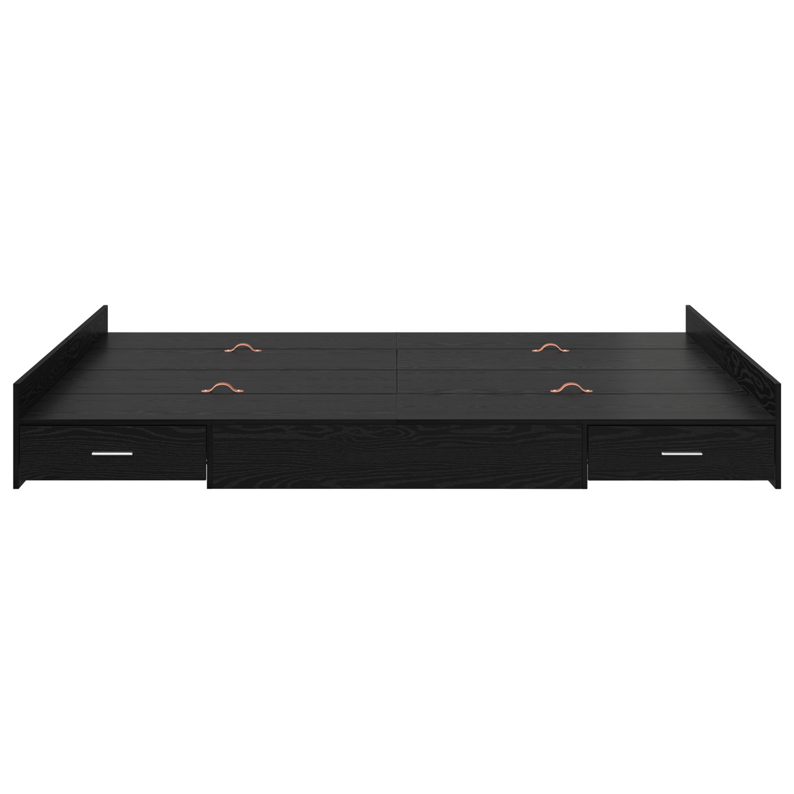 Dieses stylishe Stauraumbett ist genau das, was du für ein modernes Schlafzimmer brauchst. Es bietet sowohl praktischen Nutzen als auch tollen Stil. Der Rahmen hat ein schlichtes und sauberes Design, das perfekt zu verschiedenen Einrichtungsstilen passt. Der integrierte Stauraum ist einfach genial, um alles organisiert zu halten – perfekt für alle, die Einfachheit und Bequemlichkeit schätzen. Vielseitiges Design: Dieses rechteckige Bettgestell verbindet schickes Design mit praktischem Stauraum. Die klaren Linien und die saubere Eleganz passen super in moderne Umgebungen. Der Holzwerkstoff sorgt für einen coolen Look, der zu jedem Schlafzimmerstil passt. Integrierter Stauraum: Mit vielen Schubladen unter der Matratze ist dieses Bettgestell perfekt, um den Stauraum im Schlafzimmer clever auszunutzen. Diese Schubladen sind ideal, um Kleidung, Bettwäsche und andere wichtige Sachen zu verstauen, sodass der Platz effizient genutzt wird, ohne dass der Stil leidet. Robuste Konstruktion: Aus solidem Holzwerkstoff gefertigt ist dieses Stauraumbett stabil und langlebig. Es bietet dir eine große Stabilität für einen angenehmen Schlaf. Das Kopf- und Fußteil sorgt zusätzlich für Halt. Praktische Funktionen: Du brauchst keinen Boxspring, was die Nutzung super einfach macht. Es hat starke Latten für einen stabilen Matratzenhalt und die hochklappbare Basis verbirgt Stauraum, was die Flexibilität erhöht. Einfache Pflege: Dieses Stauraumbett zu reinigen ist ein Kinderspiel – einfach schnell mit einem feuchten Tuch abwischen. Es ist pflegeleicht und damit die beste Wahl für einen vollen Alltag, da es Bequemlichkeit und Langlebigkeit kombiniert.