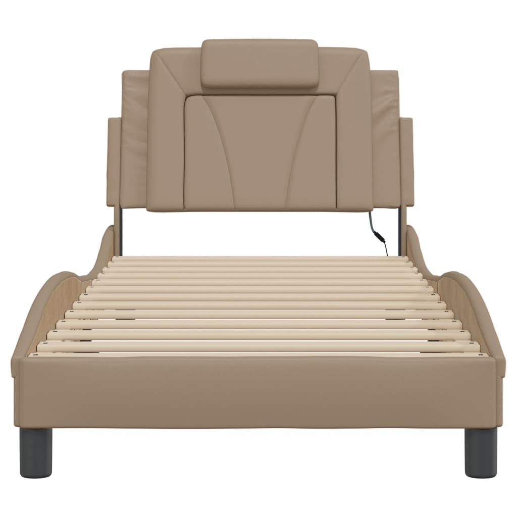 Dieses Bettgestell mit LED-Leuchten sorgt für eine erholsame Nachtruhe! Es stellt eine einladende Ergänzung zu jedem Schlafzimmer dar. Langlebiges Kunstleder: Hochwertiges Kunstleder ist ein äußerst langlebiges Material. Es ist schmutzabweisend und lässt sich mit einem feuchten Tuch einfach reinigen. Durch die glatte Oberfläche weist es die Schönheit von Echtleder und einen luxuriösen Look auf.Sperrholzlatten: Die Sperrholzlatten sorgen für eine gute Gewichtsverteilung und auch dafür, dass die Matratze bei jeder Bewegung deines Körpers während des Schlafes an Ort und Stelle bleibt. Ausgezeichnete Unterstützung: Das Kopfteil-Kissen ist mit Schaumstoff gefüllt und fühlt sich daher extra weich und komfortabel an. Es bietet eine ausgezeichnete Rückenunterstützung beim Sitzen im Bett oder Fernsehen. Bunter LED-Streifen: Die farbenfrohen LED-Leuchten bringen das Schlafzimmer zum Leuchten! Die Klettverschlüsse auf der Rückseite des Kopfteils können zur Befestigung der LED-Leuchten verwendet werden. Wellenförmiges Seitendesign: Das stilvolle und raffinierte Design in Wellenform verleiht deiner Einrichtung eine moderne und elegante Note und macht das Bettgestell zum Mittelpunkt deines Schlafzimmers. Gut zu wissen:Bei diesem Bett ist keine Matratze im Lieferumfang enthalten. Wir bieten jedoch eine große Auswahl an Matratzen an. Du kannst in unserem Shop nach einer passenden Matratze suchen.Das Produkt verfügt über einen USB-Anschluss, für den eine zertifizierte 5V-USB-Stromquelle erforderlich ist (nicht im Lieferumfang enthalten).