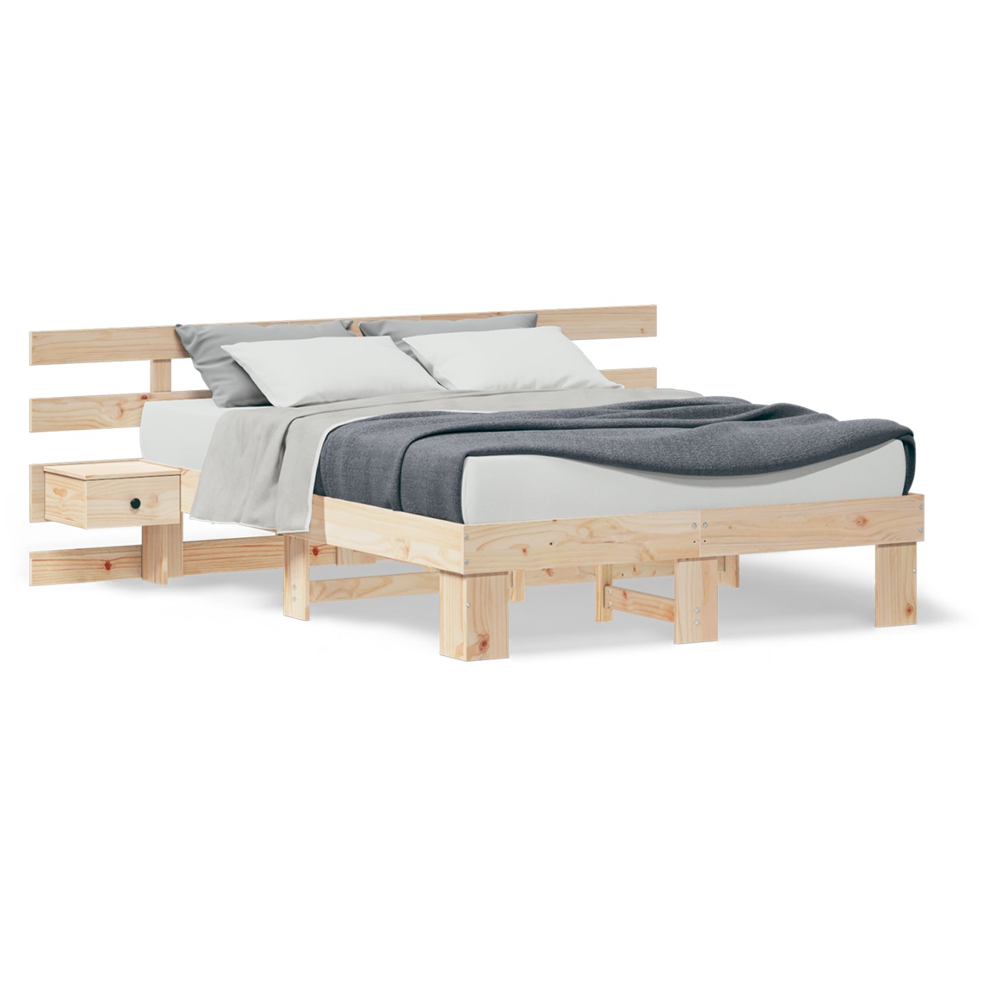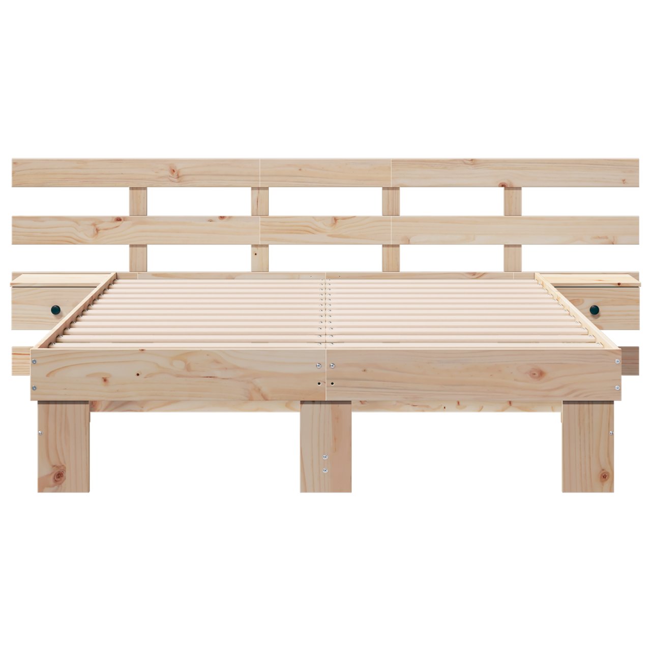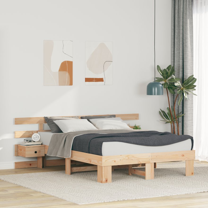 Dieses Plattformbettgestell bringt modernen Stil und praktische Vorteile in dein Zimmer. Mit seiner modernen Form aus massivem Kiefernholz sieht es schick aus und bietet starken Halt. Du brauchst keinen Lattenrost, denn das Design stützt die Matratze direkt. Das sorgt für Bequemlichkeit und Eleganz. Mit einer glatten Oberfläche ist es perfekt für jeden modernen Schlafzimmerlook. Massive Kieferkonstruktion Handgemacht aus echtem massivem Kiefernholz hat der Rahmen eine glatte Oberfläche, die die schöne Maserung zeigt. Diese Holzart ist sehr langlebig und bietet eine starke Basis für eine gute Nachtruhe. Integrierte Nachttische Zwei Nachttische auf beiden Seiten bieten praktische Aufbewahrung. Jeder hat eine Schublade für deine Nachtutensilien, verziert mit schicken Metallknöpfen für einen Hauch von Stil. Modernes Design ohne Lattenrost Der Rahmen ist stabil gebaut, sodass du keinen Lattenrost brauchst. Er unterstützt deine Matratze gut, sorgt für Stabilität und gibt deinem Schlafzimmer einen ordentlichen Look. Ideal für Schlafzimmer Dieses Bettgestell passt toll in moderne Schlafzimmer und bringt einen schicken, zeitgemäßen Touch. Die klaren Linien und das schlichte Design heben die Atmosphäre des Raums ohne Überladung. Einfach zu pflegen Es ist ganz leicht, das Bett frisch zu halten. Wische einfach mit einem feuchten Tuch darüber, um die glatte Oberfläche sauber zu halten.