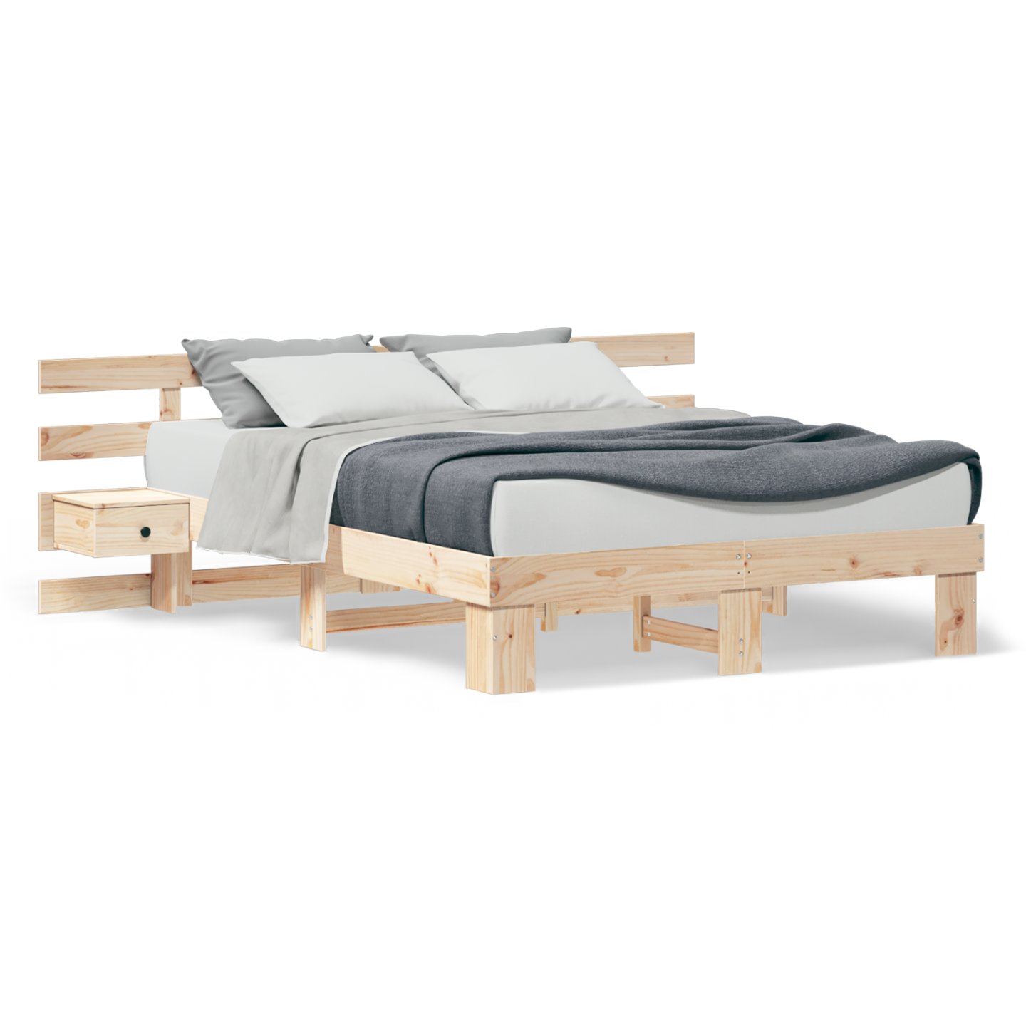 Dieses Plattformbettgestell bringt modernen Stil und praktische Vorteile in dein Zimmer. Mit seiner modernen Form aus massivem Kiefernholz sieht es schick aus und bietet starken Halt. Du brauchst keinen Lattenrost, denn das Design stützt die Matratze direkt. Das sorgt für Bequemlichkeit und Eleganz. Mit einer glatten Oberfläche ist es perfekt für jeden modernen Schlafzimmerlook. Massive Kieferkonstruktion Handgemacht aus echtem massivem Kiefernholz hat der Rahmen eine glatte Oberfläche, die die schöne Maserung zeigt. Diese Holzart ist sehr langlebig und bietet eine starke Basis für eine gute Nachtruhe. Integrierte Nachttische Zwei Nachttische auf beiden Seiten bieten praktische Aufbewahrung. Jeder hat eine Schublade für deine Nachtutensilien, verziert mit schicken Metallknöpfen für einen Hauch von Stil. Modernes Design ohne Lattenrost Der Rahmen ist stabil gebaut, sodass du keinen Lattenrost brauchst. Er unterstützt deine Matratze gut, sorgt für Stabilität und gibt deinem Schlafzimmer einen ordentlichen Look. Ideal für Schlafzimmer Dieses Bettgestell passt toll in moderne Schlafzimmer und bringt einen schicken, zeitgemäßen Touch. Die klaren Linien und das schlichte Design heben die Atmosphäre des Raums ohne Überladung. Einfach zu pflegen Es ist ganz leicht, das Bett frisch zu halten. Wische einfach mit einem feuchten Tuch darüber, um die glatte Oberfläche sauber zu halten.