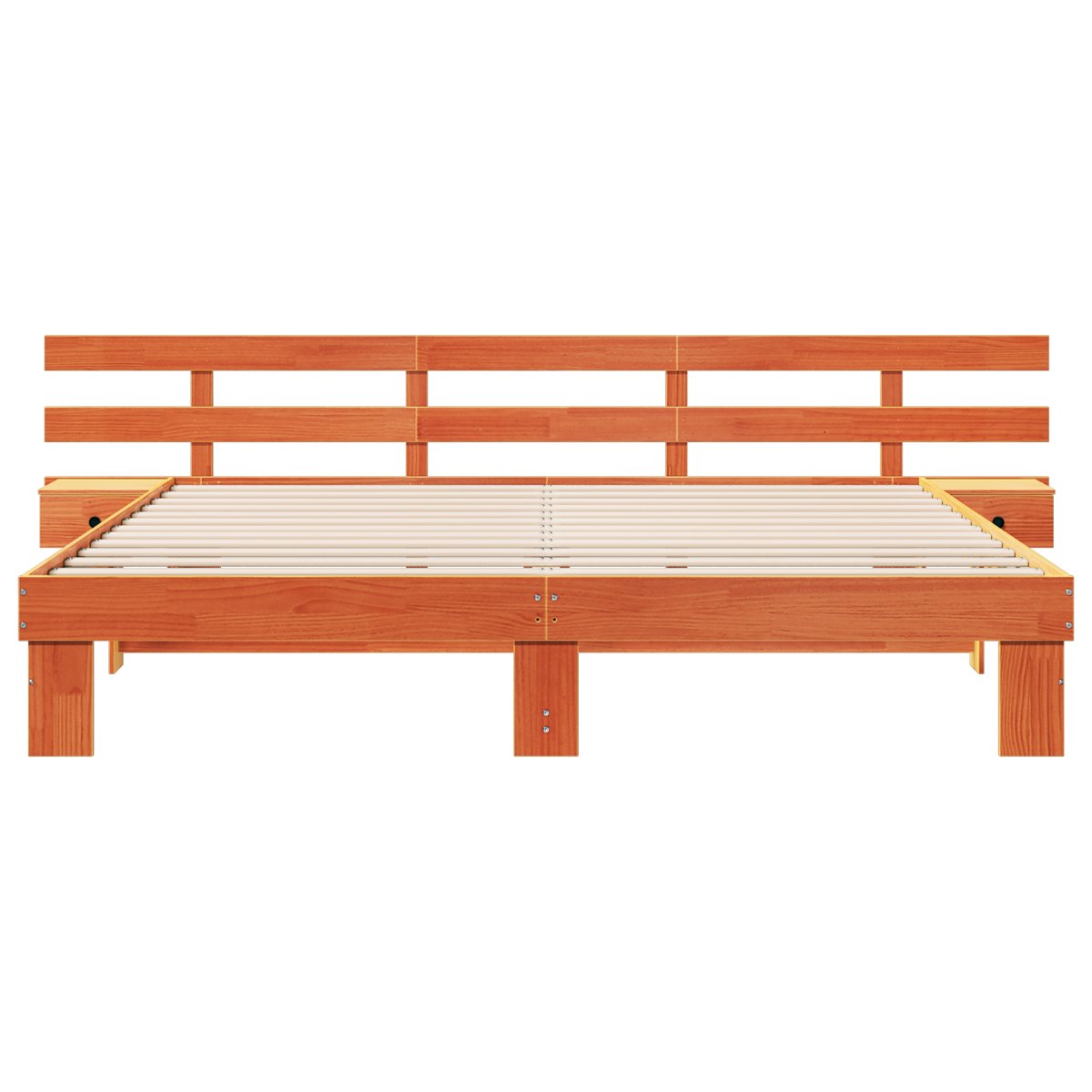Dieses Plattformbettgestell bringt modernen Stil und praktische Vorteile in dein Zimmer. Mit seiner modernen Form aus massivem Kiefernholz sieht es schick aus und bietet starken Halt. Du brauchst keinen Lattenrost, denn das Design stützt die Matratze direkt. Das sorgt für Bequemlichkeit und Eleganz. Mit einer glatten Oberfläche ist es perfekt für jeden modernen Schlafzimmerlook. Massive Kieferkonstruktion Handgemacht aus echtem massivem Kiefernholz hat der Rahmen eine glatte Oberfläche, die die schöne Maserung zeigt. Diese Holzart ist sehr langlebig und bietet eine starke Basis für eine gute Nachtruhe. Integrierte Nachttische Zwei Nachttische auf beiden Seiten bieten praktische Aufbewahrung. Jeder hat eine Schublade für deine Nachtutensilien, verziert mit schicken Metallknöpfen für einen Hauch von Stil. Modernes Design ohne Lattenrost Der Rahmen ist stabil gebaut, sodass du keinen Lattenrost brauchst. Er unterstützt deine Matratze gut, sorgt für Stabilität und gibt deinem Schlafzimmer einen ordentlichen Look. Ideal für Schlafzimmer Dieses Bettgestell passt toll in moderne Schlafzimmer und bringt einen schicken, zeitgemäßen Touch. Die klaren Linien und das schlichte Design heben die Atmosphäre des Raums ohne Überladung. Einfach zu pflegen Es ist ganz leicht, das Bett frisch zu halten. Wische einfach mit einem feuchten Tuch darüber, um die glatte Oberfläche sauber zu halten.