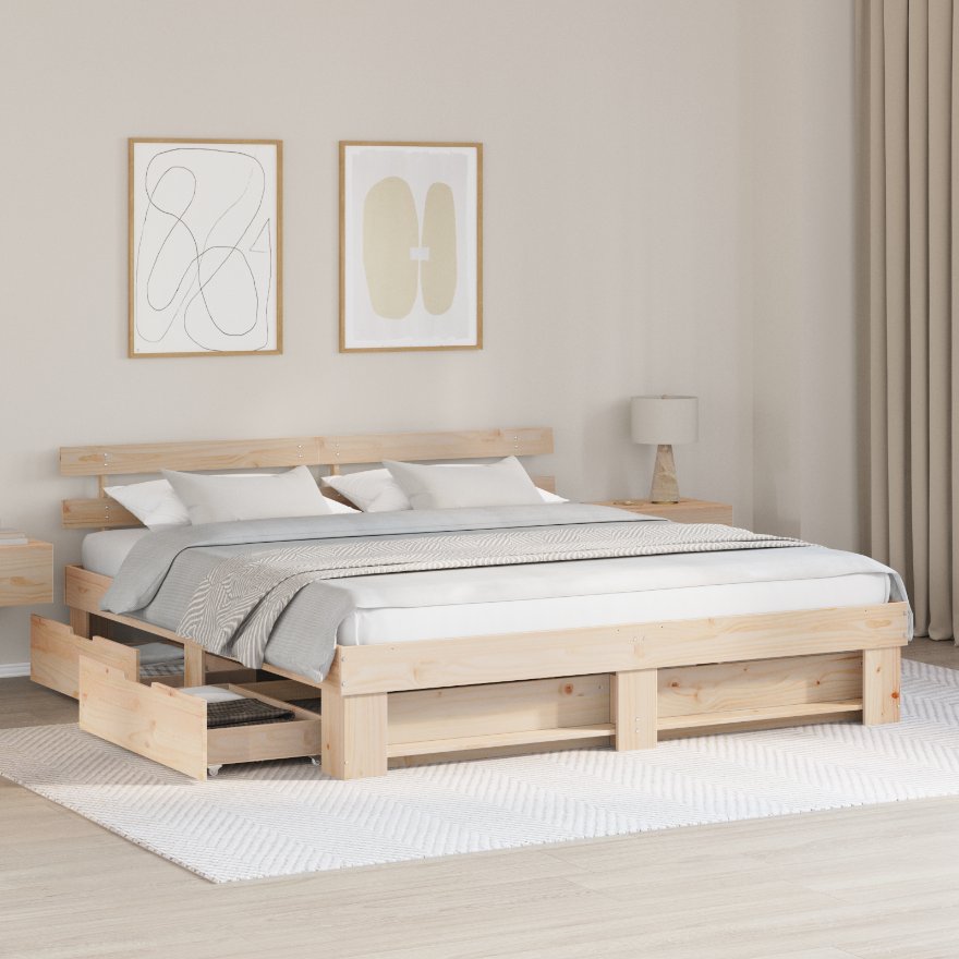 Dieses Plattformbett hat ein minimalistisches Design, das perfekt zu modernen Schlafzimmern passt. Hergestellt aus solidem Kiefernholz, bringt es einen Hauch von natürlicher Eleganz und der Stauraum darunter ist super praktisch, um alles ordentlich zu halten. Es geht darum, einfach und praktisch zu sein, ohne Boxsprings, und es verleiht deinem Schlafzimmer eine frische Atmosphäre. Robuste Kieferstruktur : Dieser Bettrahmen aus solidem Kiefernholz ist stabil und sieht gut aus. Eine echt gute Investition für dein Schlafzimmer. Funktionale Stauraumschubladen : Das Bett hat zwei Schubladen aus solidem Kiefernholz unter dem Bett. Diese geräumigen Schubladen sind perfekt, um dein Schlafzimmer ordentlich zu halten und bieten Platz für Bettwäsche und Decken. Modernes und minimalistisches Design : Die klaren Linien und die simple Form des Bettes schaffen ein frisches Gefühl in deinem Raum. Der minimalistische Stil ist pflegeleicht und passt super zu verschiedenen Schlafzimmerdesigns. Robuster Rahmen : Du brauchst keine Boxspringmatratze, und der stabile Lattenrahmen kann bis zu 110 kg tragen, was für Komfort und Stabilität sorgt. Dieses clevere Design spart Geld und macht das Leben leichter. Effiziente Montage : Der Aufbau geht einfach mit zwei Leuten und einem Schraubendreher sowie einem Hammer. Auch wenn es stark ist, ist der Zusammenbau easy, sodass du es problemlos in dein Zuhause integrieren kannst.