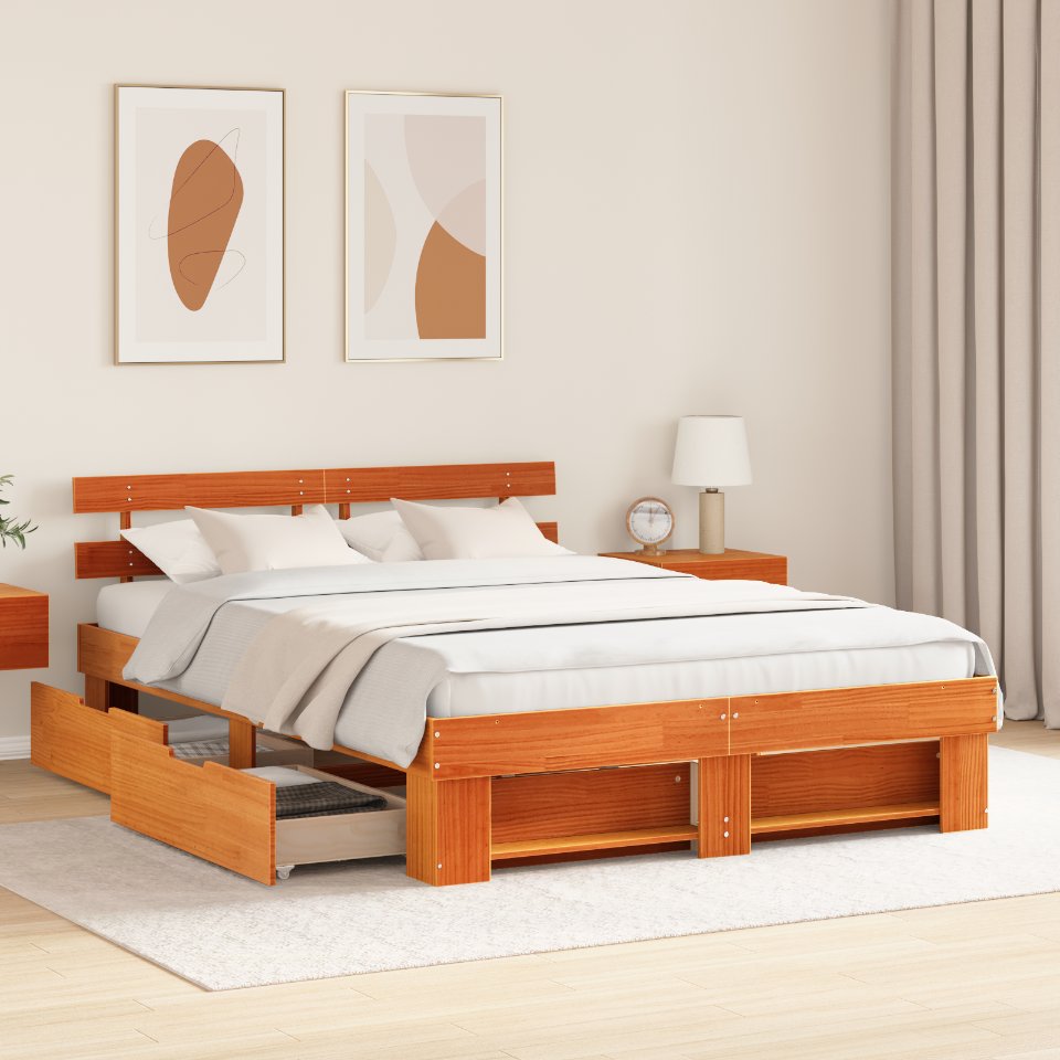 Dieses Plattformbett hat ein minimalistisches Design, das perfekt zu modernen Schlafzimmern passt. Hergestellt aus solidem Kiefernholz, bringt es einen Hauch von natürlicher Eleganz und der Stauraum darunter ist super praktisch, um alles ordentlich zu halten. Es geht darum, einfach und praktisch zu sein, ohne Boxsprings, und es verleiht deinem Schlafzimmer eine frische Atmosphäre. Robuste Kieferstruktur : Dieser Bettrahmen aus solidem Kiefernholz ist stabil und sieht gut aus. Eine echt gute Investition für dein Schlafzimmer. Funktionale Stauraumschubladen : Das Bett hat zwei Schubladen aus solidem Kiefernholz unter dem Bett. Diese geräumigen Schubladen sind perfekt, um dein Schlafzimmer ordentlich zu halten und bieten Platz für Bettwäsche und Decken. Modernes und minimalistisches Design : Die klaren Linien und die simple Form des Bettes schaffen ein frisches Gefühl in deinem Raum. Der minimalistische Stil ist pflegeleicht und passt super zu verschiedenen Schlafzimmerdesigns. Robuster Rahmen : Du brauchst keine Boxspringmatratze, und der stabile Lattenrahmen kann bis zu 110 kg tragen, was für Komfort und Stabilität sorgt. Dieses clevere Design spart Geld und macht das Leben leichter. Effiziente Montage : Der Aufbau geht einfach mit zwei Leuten und einem Schraubendreher sowie einem Hammer. Auch wenn es stark ist, ist der Zusammenbau easy, sodass du es problemlos in dein Zuhause integrieren kannst.