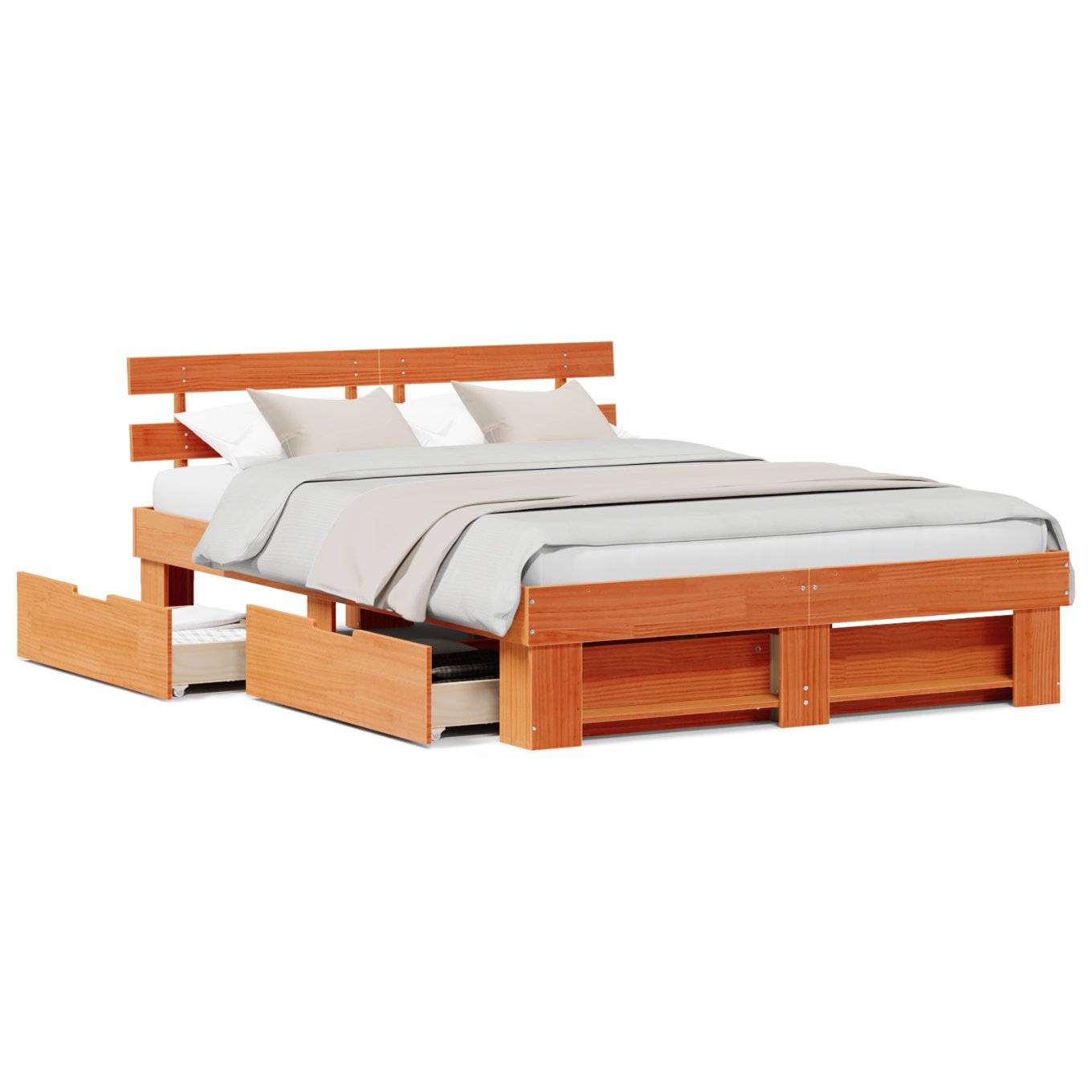 Dieses Plattformbett hat ein minimalistisches Design, das perfekt zu modernen Schlafzimmern passt. Hergestellt aus solidem Kiefernholz, bringt es einen Hauch von natürlicher Eleganz und der Stauraum darunter ist super praktisch, um alles ordentlich zu halten. Es geht darum, einfach und praktisch zu sein, ohne Boxsprings, und es verleiht deinem Schlafzimmer eine frische Atmosphäre. Robuste Kieferstruktur : Dieser Bettrahmen aus solidem Kiefernholz ist stabil und sieht gut aus. Eine echt gute Investition für dein Schlafzimmer. Funktionale Stauraumschubladen : Das Bett hat zwei Schubladen aus solidem Kiefernholz unter dem Bett. Diese geräumigen Schubladen sind perfekt, um dein Schlafzimmer ordentlich zu halten und bieten Platz für Bettwäsche und Decken. Modernes und minimalistisches Design : Die klaren Linien und die simple Form des Bettes schaffen ein frisches Gefühl in deinem Raum. Der minimalistische Stil ist pflegeleicht und passt super zu verschiedenen Schlafzimmerdesigns. Robuster Rahmen : Du brauchst keine Boxspringmatratze, und der stabile Lattenrahmen kann bis zu 110 kg tragen, was für Komfort und Stabilität sorgt. Dieses clevere Design spart Geld und macht das Leben leichter. Effiziente Montage : Der Aufbau geht einfach mit zwei Leuten und einem Schraubendreher sowie einem Hammer. Auch wenn es stark ist, ist der Zusammenbau easy, sodass du es problemlos in dein Zuhause integrieren kannst.