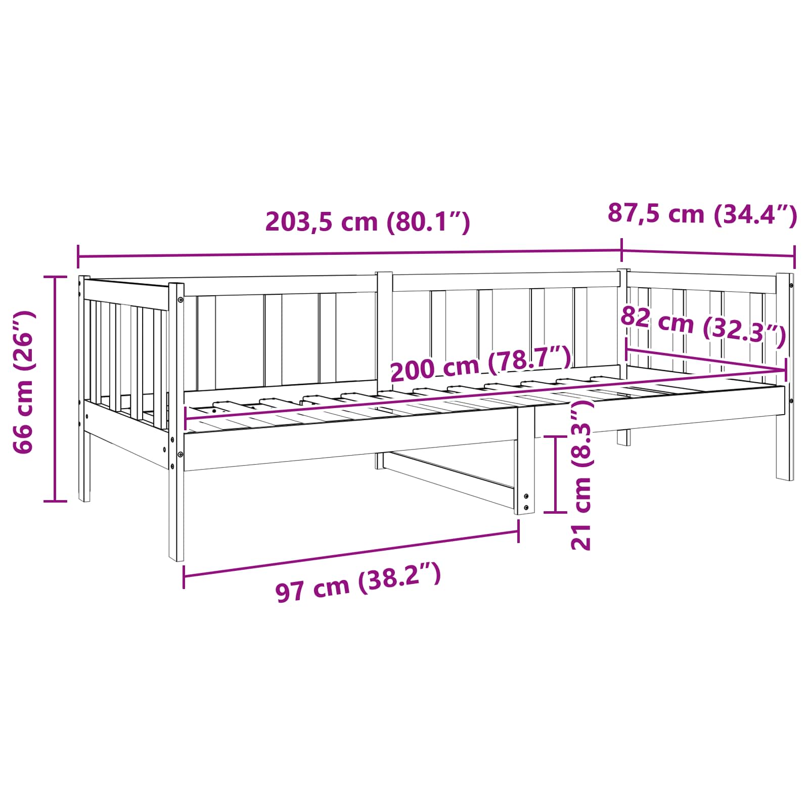 - Gesamtabmessungen: 87,5 x 203,5 x 66 cm (L x B x H)