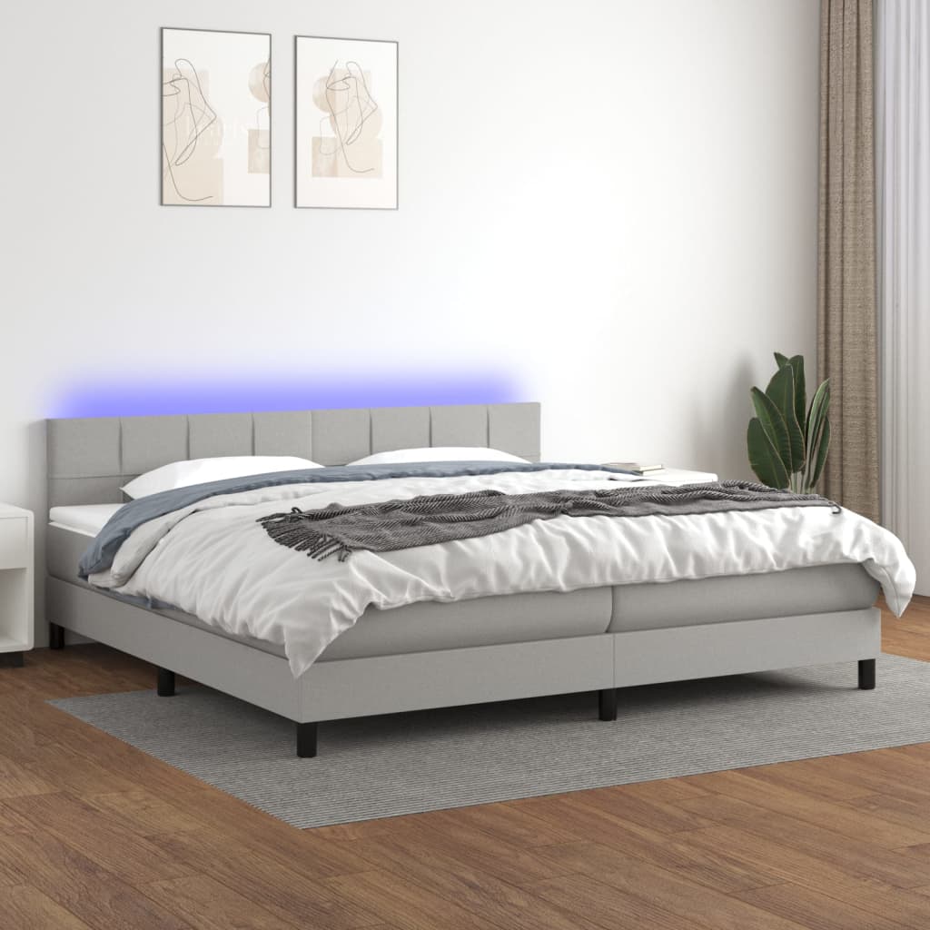 Nutze dieses Boxspringbett mit Matratze und LED für einen erholsamen Schlaf! Es wird der Mittelpunkt deines Schlafzimmers. Strapazierfähiger Stoff: Der Stoff weist eine schlichte und saubere Optik auf und ist außerdem atmungsaktiv und langlebig.Praktisches Kopfteil: Das Bett-Kopfteil ist nach Belieben höhenverstellbar. Es ist eine hervorragende Rückenlehne, während du im Bett sitzt, liest oder fern siehst.Bunter LED-Streifen: Die farbenfrohen LED-Leuchten erzeugen Verspieltheit in der Dunkelheit!Taschenfederkernmatratze: Die eingebaute Einzeltaschenfederkernmatratze zeichnet sich durch sehr hohe Qualität aus und gewährleistet gleichzeitig eine hohe Strapazierfähigkeit und Anpassungsfähigkeit. Sie absorbiert effektiv die durch das Werfen und Drehen verursachten Geräusche und Stöße.Hautfreundliche Matratzenauflage: Der Matratzenschoner ist mit einem strapazierfähigen sowie hautfreundlichen Stoffbezug versehen und fühlt sich daher weich und angenehm an. Hinweis:Aus hygienischen Gründen kann die Matratze nicht zurückgegeben werden, wenn die Verpackung entfernt oder geöffnet wurde.Jedes Produkt wird mit einer Montageanleitung in der Verpackung für eine einfache Montage geliefert.Nur der Teil mit dem Symbol kann geschnitten werden und nur der Teil mit dem USB funktioniert auch weiterhin.Das Produkt verfügt über einen USB-Anschluss, aber die zertifizierte 5-V-USB-Stromquelle ist nicht im Lieferumfang enthalten.