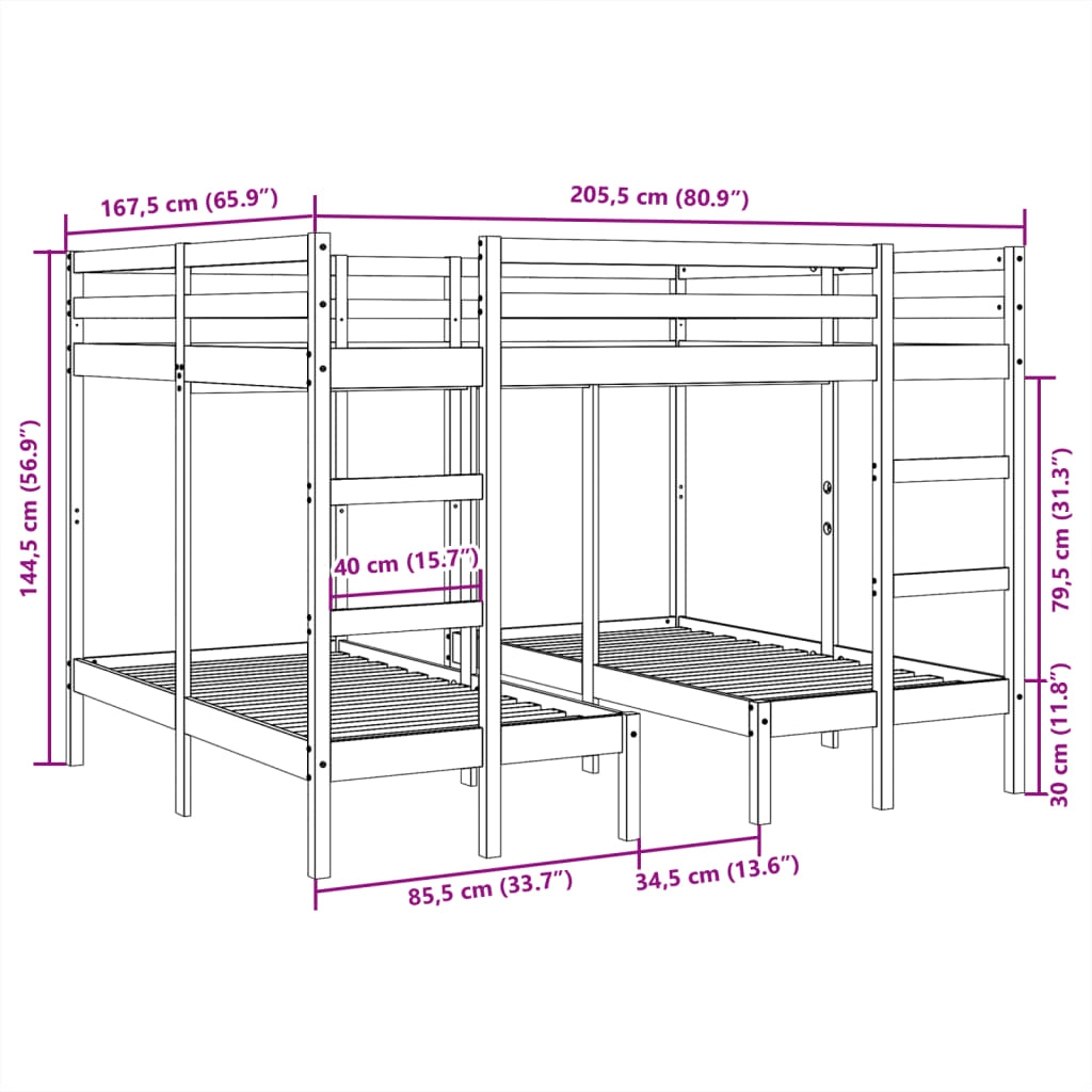 Dieses Etagenbett vereint drei Betten in einem und bietet dadurch eine platzsparende Alternative, sei es für Übernachtungsgäste, Pyjamapartys oder Familien mit mehreren Kindern. Stabiles und langlebiges Gestell: Massives Kiefernholz ist für seine Stärke und Haltbarkeit bekannt. Seine gerade Maserung und die charakteristischen Aststellen tragen zu seinem rustikalen Charme bei. Optimale Raumausnutzung: Dieses Dreierbett vereint ein oberes Doppelbett mit zwei unteren Einzelbetten und bietet dadurch eine platzsparende Lösung für Übernachtungsgäste, Pyjamapartys oder Familien mit mehreren Kindern. Einfaches Auf- und Absteigen: Dieser Bettrahmen verfügt über zwei eingebaute Leitern, die den Benutzern einen bequemen Zugang zum Bett ermöglichen. Rausfallschutz für mehr Sicherheit: Das Hochbett ist mit Rausfallschutz versehen, der das Herunterfallen während des Schlafs zu verhindert. Lattenrost für optimale Unterstützung: Der Bettrahmen ist mit einem Lattenrost ausgestattet, der deine Matratze stützt und atmungsaktiv hält. Geräumiger Stauraum unter dem Bett: Dieser Bettrahmen bietet ausreichend Platz darunter, z.B. für Aufbewahrungsboxen, Körbe, Schubladen und mehr. Achtung: Um ein Umkippen zu vermeiden, sollte dieses Produkt mit der mitgelieferten Wandhalterung gesichert werden. Gut zu wissen: Bei diesem Bett sind keine Matratzen im Lieferumfang enthalten. Wir bieten jedoch eine große Auswahl an Matratzen an. Du kannst in unserem Shop nach der passenden Matratze suchen. Schrauben und Dübel für die Montage an der Wand sind nicht enthalten. Passendes Montagezubehör muss separat gekauft werden. Wenn du dir bezüglich der Montage nicht sicher bist, wende dich bitte an einen Fachmann. Bitte lies und befolge jeden Schritt in der Anleitung.