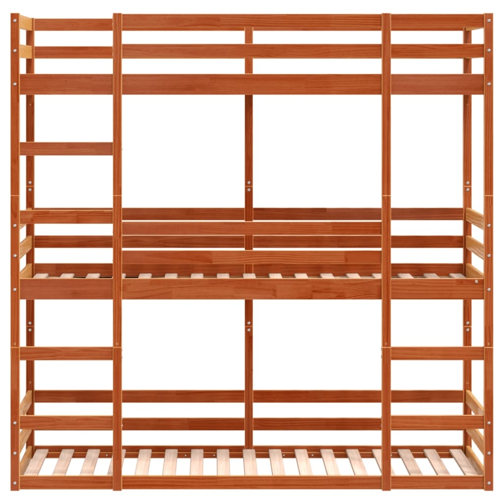 Dieses elegante und praktische Dreifach-Etagenbett aus Holz ist die perfekte Ergänzung zu jedem Zimmer mit begrenztem Platzangebot. Robust und stabil: Massives Kiefernholz ist für seine Stärke und Haltbarkeit bekannt. Seine gerade Maserung und die charakteristischen Aststellen tragen zu seinem rustikalen Charme bei.Rausfallschutz: Jedes Bett ist an allen 4 Seiten mit Schutzgittern versehen, um das Herausfallen während des Schlafs zu verhindern.Praktische Leiter: Die Leiter erleichtert den Einstieg ins obere Bett und bietet mehr Sicherheit und Stabilität.Optimale Raumnutzung: Dieses Dreierbett nutzt vertikalen Raum optimal aus und lässt sich leicht in separate Einzel- und Plattformbetten umbauen. Es eignet sich perfekt für große Familien oder spontane Übernachtungsgäste und wird den unterschiedlichsten Anforderungen gerecht. Gut zu wissen:Im Lieferumfang sind nur die Bettgestelle enthalten. Die Matratzen sind nicht Teil des Angebots. Passende Matratzen findest du in unserem Shop.Schrauben und Dübel für die Montage an der Wand sind nicht enthalten. Passendes Montagezubehör muss separat gekauft werden. Wenn du dir bezüglich der Montage nicht sicher bist, wende dich bitte an einen Fachmann. Bitte lies und befolge jeden Schritt in der Anleitung.