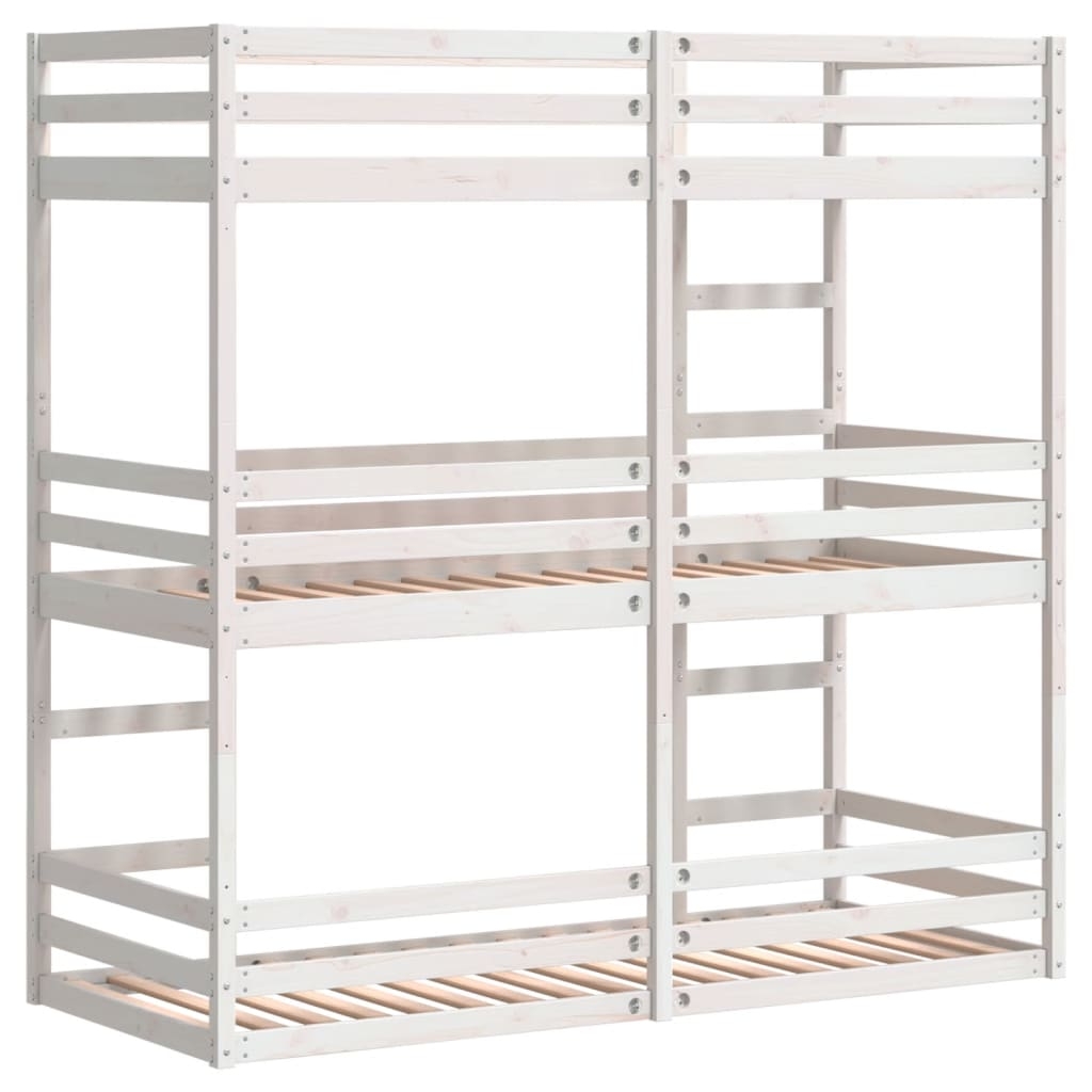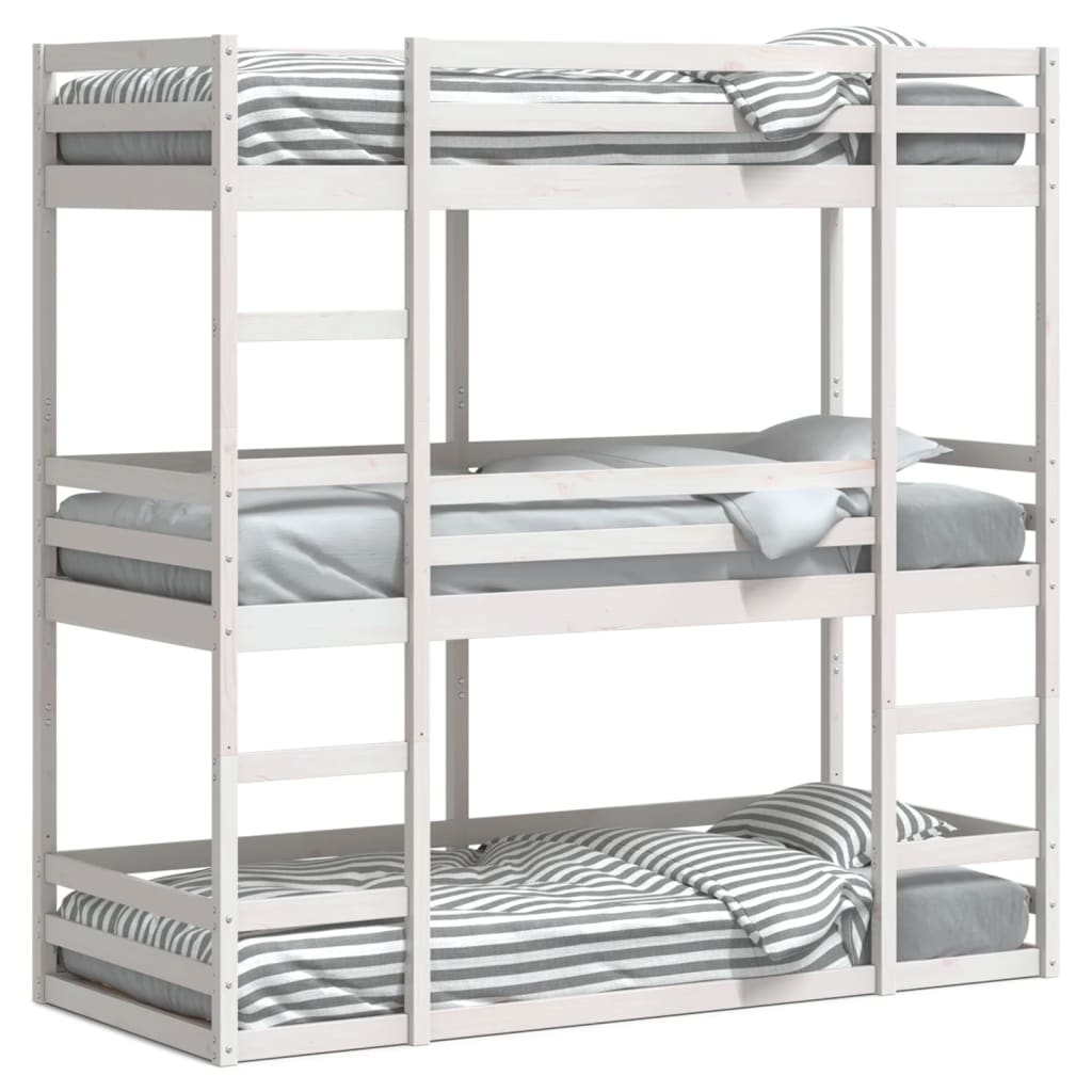 Dieses elegante und praktische Dreifach-Etagenbett aus Holz ist die perfekte Ergänzung zu jedem Zimmer mit begrenztem Platzangebot. Robust und stabil: Massives Kiefernholz ist für seine Stärke und Haltbarkeit bekannt. Seine gerade Maserung und die charakteristischen Aststellen tragen zu seinem rustikalen Charme bei.Rausfallschutz: Jedes Bett ist an allen 4 Seiten mit Schutzgittern versehen, um das Herausfallen während des Schlafs zu verhindern.Praktische Leiter: Die Leiter erleichtert den Einstieg ins obere Bett und bietet mehr Sicherheit und Stabilität.Optimale Raumnutzung: Dieses Dreierbett nutzt vertikalen Raum optimal aus und lässt sich leicht in separate Einzel- und Plattformbetten umbauen. Es eignet sich perfekt für große Familien oder spontane Übernachtungsgäste und wird den unterschiedlichsten Anforderungen gerecht. Gut zu wissen:Im Lieferumfang sind nur die Bettgestelle enthalten. Die Matratzen sind nicht Teil des Angebots. Passende Matratzen findest du in unserem Shop.Schrauben und Dübel für die Montage an der Wand sind nicht enthalten. Passendes Montagezubehör muss separat gekauft werden. Wenn du dir bezüglich der Montage nicht sicher bist, wende dich bitte an einen Fachmann. Bitte lies und befolge jeden Schritt in der Anleitung.