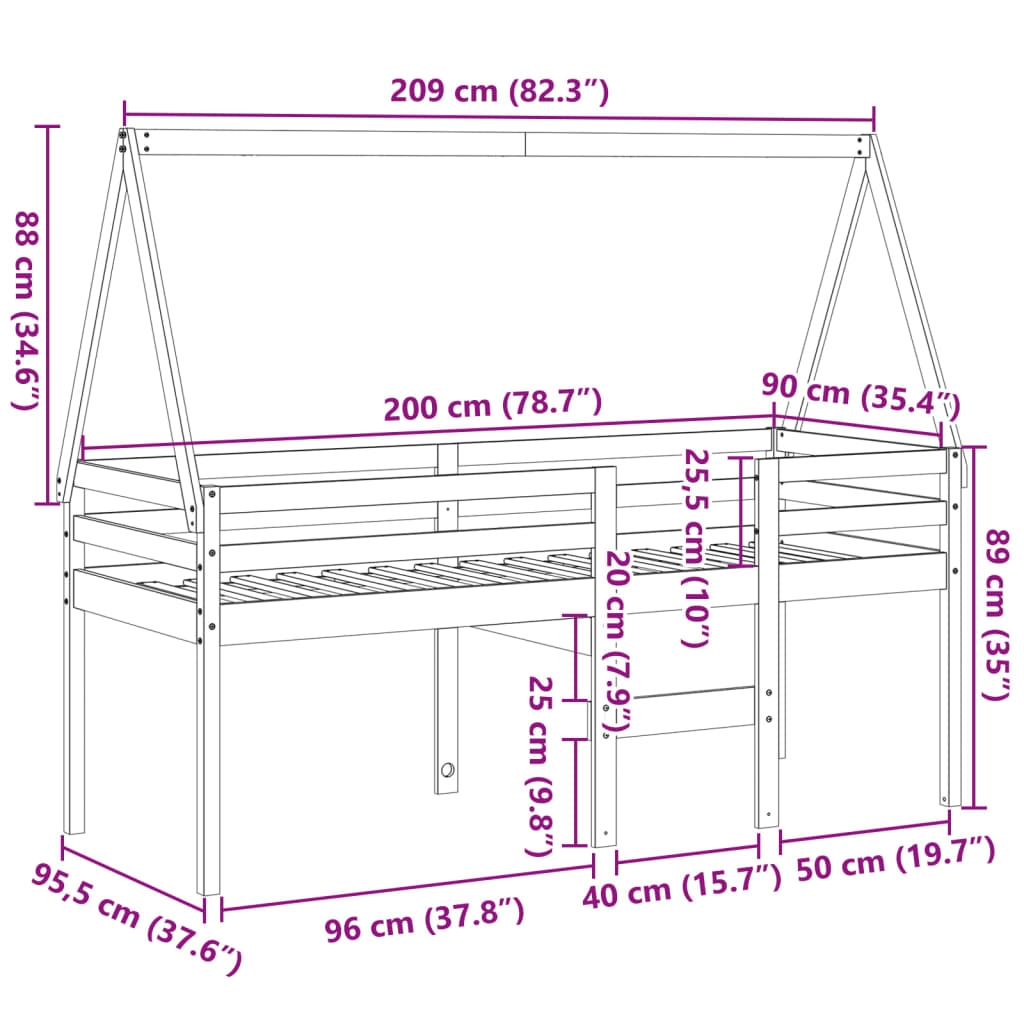 Dieses Hochbett, bei dem die Vielseitigkeit im Mittelpunkt steht, ist eine perfekte Kombination aus schlichtem, modernem Design und Zweckmäßigkeit. Es ist ideal für kleine Räume. Massives Kiefernholz: Massives Kiefernholz ist ein wunderschönes Naturmaterial. Kiefernholz weist eine gerade Maserung auf und die Aststellen verleihen dem Material seine charakteristische, rustikale Optik.Praktische Funktion: Das Hochbett eignet sich hervorragend, um den Platz im Kinderzimmer optimal auszunutzen. Du kannst es mit einem coolen Spielvorhang, einer Spielmatratze und einem Spielzelt kombinieren oder den Platz unter der Liegefläche als Stauraum nutzen. Die Latten aus Sperrholz bieten zusätzlichen Halt. Sie verlängern die Lebensdauer der Matratze, indem sie den größten Teil der Belastung und des Gewichts aufnehmen.Sicheres Design: Die in das Hochbett eingebaute Leiter erleichtert das Ein- und Aussteigen, und die Geländer sorgen dafür, dass deine Kleinen sicher schlummern können.Viel Spaß: Durch das Anbringen dieses Dachgestells am Kinderbett kannst du einen Rückzugsort schaffen, der deinem Kind viel Spaß vor dem Schlafengehen bietet. Diese innovative Ergänzung wird nicht nur ein spannender Blickfang sein, sondern auch für Staunen und Spannung im Kinderzimmer sorgen.Offene Seite: Das Dach verfügt über eine offene Seite, die den Kindern den Ein- und Ausstieg erleichtert, Gut zu wissen:Bei diesem Bett ist keine Matratze im Lieferumfang enthalten. Wir bieten jedoch eine große Auswahl an Matratzen an. Du kannst in unserem Shop nach einer passenden Matratze suchen.