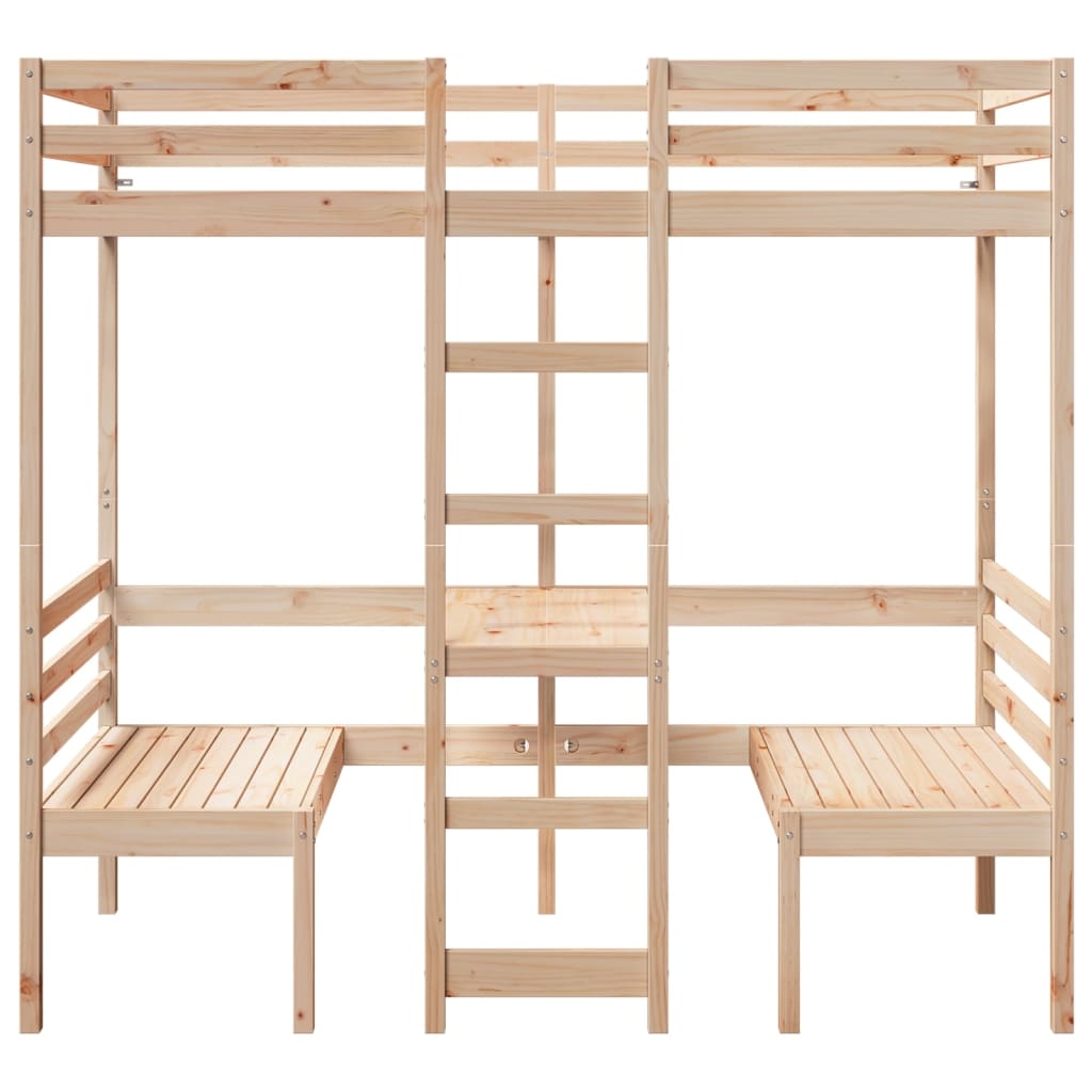 Dieses vielseitige Hochbett vereint ein Einzelbett mit einem Schreibtisch und Stühlen und bietet sowohl einen gemütlichen Schlafplatz als auch einen geräumigen Arbeitsbereich. Es ist die ideale Wahl für Wohnungen mit begrenztem Platzangebot.Stabiles und langlebiges Gestell: Massives Kiefernholz ist für seine Stärke und Haltbarkeit bekannt. Seine gerade Maserung und die charakteristischen Aststellen tragen zu seinem rustikalen Charme bei.Optimale Raumausnutzung: Dieses Bettgestell ist mit einem Schreibtisch und zwei Stühlen unter der Liegefläche versehen, um den Bereich unter dem Bett optimal auszunutzen und auch einen gemütlichen Platz zum Arbeiten und Lernen zu bieten. Es ist daher eine ideale Wahl für kleinere Räume.Einfaches Auf- und Absteigen: Dieser Bettrahmen verfügt über eine eingebaute Leiter, die den Benutzern einen bequemen Zugang zum Bett ermöglicht.Rausfallschutz für mehr Sicherheit: Das Hochbett ist mit Rausfallschutz versehen, der das Herunterfallen während des Schlafs zu verhindert.Lattenrost für optimale Unterstützung: Der Bettrahmen ist mit einem Lattenrost ausgestattet, der deine Matratze stützt und atmungsaktiv hält.Achtung:Um ein Umkippen zu vermeiden, sollte dieses Produkt mit der mitgelieferten Wandhalterung gesichert werden.Gut zu wissen:Bei diesem Bett ist keine Matratze im Lieferumfang enthalten. Wir bieten jedoch eine große Auswahl an Matratzen an. Du kannst in unserem Shop nach einer passenden Matratze suchen.Schrauben und Dübel für die Montage an der Wand sind nicht enthalten. Passendes Montagezubehör muss separat gekauft werden. Wenn du dir bezüglich der Montage nicht sicher bist, wende dich bitte an einen Fachmann. Bitte lies und befolge jeden Schritt in der Anleitung.
