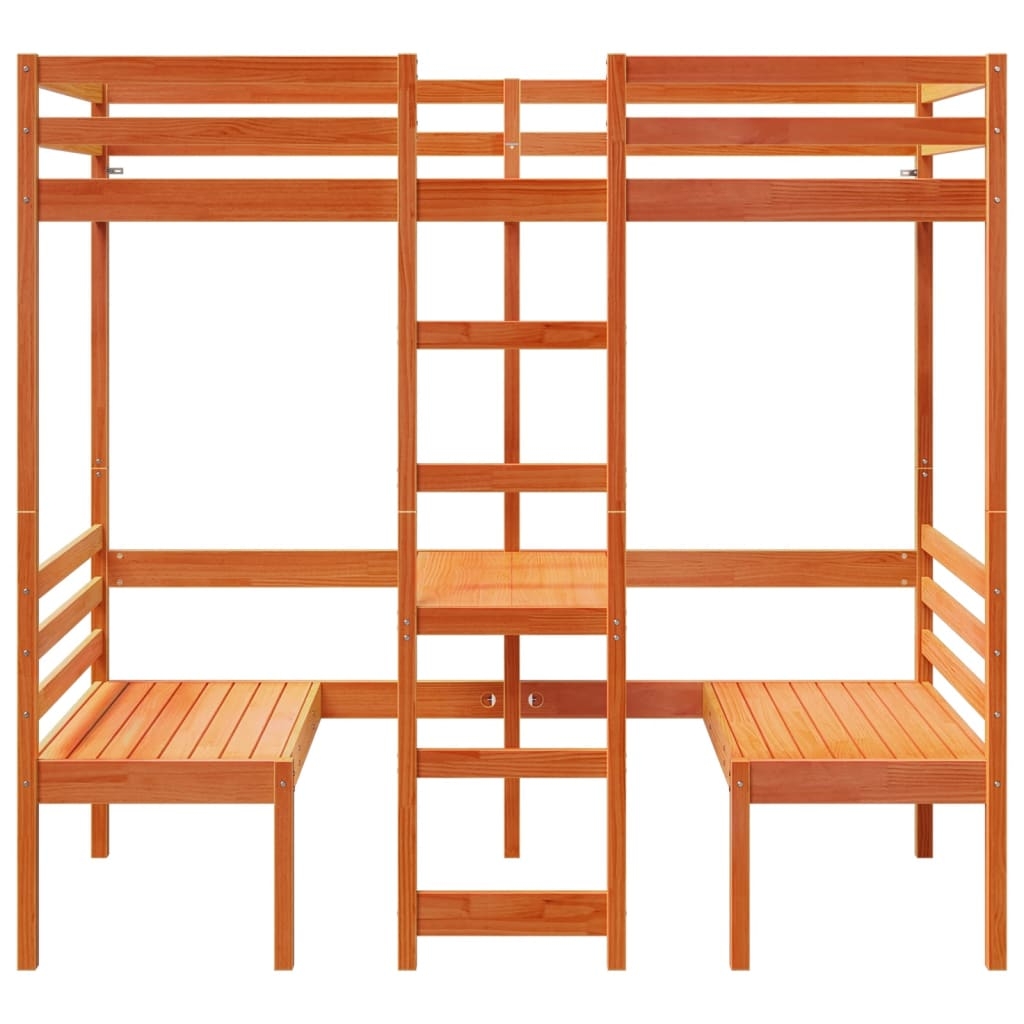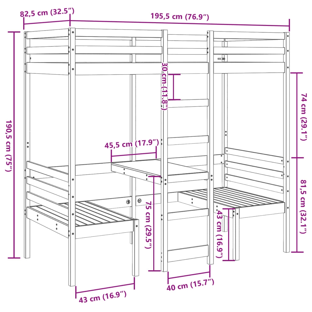 Dieses vielseitige Hochbett vereint ein Einzelbett mit einem Schreibtisch und Stühlen und bietet sowohl einen gemütlichen Schlafplatz als auch einen geräumigen Arbeitsbereich. Es ist die ideale Wahl für Wohnungen mit begrenztem Platzangebot.Stabiles und langlebiges Gestell: Massives Kiefernholz ist für seine Stärke und Haltbarkeit bekannt. Seine gerade Maserung und die charakteristischen Aststellen tragen zu seinem rustikalen Charme bei.Optimale Raumausnutzung: Dieses Bettgestell ist mit einem Schreibtisch und zwei Stühlen unter der Liegefläche versehen, um den Bereich unter dem Bett optimal auszunutzen und auch einen gemütlichen Platz zum Arbeiten und Lernen zu bieten. Es ist daher eine ideale Wahl für kleinere Räume.Einfaches Auf- und Absteigen: Dieser Bettrahmen verfügt über eine eingebaute Leiter, die den Benutzern einen bequemen Zugang zum Bett ermöglicht.Rausfallschutz für mehr Sicherheit: Das Hochbett ist mit Rausfallschutz versehen, der das Herunterfallen während des Schlafs zu verhindert.Lattenrost für optimale Unterstützung: Der Bettrahmen ist mit einem Lattenrost ausgestattet, der deine Matratze stützt und atmungsaktiv hält.Achtung:Um ein Umkippen zu vermeiden, sollte dieses Produkt mit der mitgelieferten Wandhalterung gesichert werden.Gut zu wissen:Bei diesem Bett ist keine Matratze im Lieferumfang enthalten. Wir bieten jedoch eine große Auswahl an Matratzen an. Du kannst in unserem Shop nach einer passenden Matratze suchen.Schrauben und Dübel für die Montage an der Wand sind nicht enthalten. Passendes Montagezubehör muss separat gekauft werden. Wenn du dir bezüglich der Montage nicht sicher bist, wende dich bitte an einen Fachmann. Bitte lies und befolge jeden Schritt in der Anleitung.