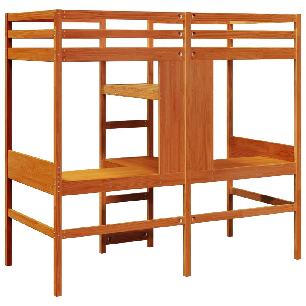 Dieses vielseitige Hochbett vereint ein Einzelbett mit einem Schreibtisch und Ablagen und bietet dadurch sowohl einen gemütlichen Schlafplatz als auch einen geräumigen Arbeitsbereich und zusätzlichen Stauraum. Es ist die ideale Wahl für Wohnungen mit begrenztem Platzangebot. Stabiles und langlebiges Gestell: Massives Kiefernholz ist für seine Stärke und Haltbarkeit bekannt. Seine gerade Maserung und die charakteristischen Aststellen tragen zu seinem rustikalen Charme bei. Optimale Raumausnutzung: Dieses Bettgestell ist mit zwei Schreibtischen und zwei Ablagen unter der Liegefläche versehen, um den Bereich unter dem Bett optimal auszunutzen. Es schafft dadurch reichlich Stauraum für Alltagssachen und bietet auch einen gemütlichen Platz zum Arbeiten und Lernen. Es ist daher eine ideale Wahl für kleinere Räume. Einfaches Auf- und Absteigen: Dieser Bettrahmen verfügt über eine eingebaute Leiter, die den Benutzern einen bequemen Zugang zum Bett ermöglicht. Rausfallschutz für mehr Sicherheit: Das Hochbett ist mit Rausfallschutz versehen, der das Herunterfallen während des Schlafs zu verhindert. Lattenrost für optimale Unterstützung: Der Bettrahmen ist mit einem Lattenrost ausgestattet, der deine Matratze stützt und atmungsaktiv hält. Achtung: Um ein Umkippen zu vermeiden, sollte dieses Produkt mit der mitgelieferten Wandhalterung gesichert werden. Gut zu wissen: Bei diesem Bett ist keine Matratze im Lieferumfang enthalten. Wir bieten jedoch eine große Auswahl an Matratzen an. Du kannst in unserem Shop nach einer passenden Matratze suchen. Schrauben und Dübel für die Montage an der Wand sind nicht enthalten. Passendes Montagezubehör muss separat gekauft werden. Wenn du dir bezüglich der Montage nicht sicher bist, wende dich bitte an einen Fachmann. Bitte lies und befolge jeden Schritt in der Anleitung.