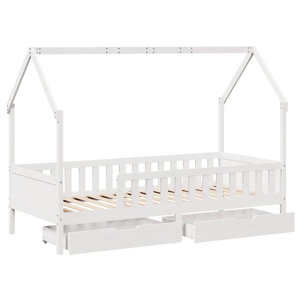 Dieses fantastische Hausbett aus Holz wird das Lieblingsbett deines Kindes sein, egal ob es gerade von seinem nächsten Abenteuer träumt oder in den Schlaf fällt. Stabiles und langlebiges Gestell: Massives Kiefernholz ist für seine Stärke und Haltbarkeit bekannt. Seine gerade Maserung und die charakteristischen Aststellen tragen zu seinem rustikalen Charme bei.Verspieltes Haus-Design: Dieses verspielte, von einem Haus inspirierte Kinderbett verwandelt die Schlafenszeit in ein tolles Abenteuer für die Kleinen. Es bietet ein gemütliches Plätzchen für die Schlafenszeit und einen spielerischen Bereich für fantasievolle Spiele.Schienen für mehr Sicherheit: Dieses Bettgestell ist mit Seitengittern ausgestattet, die verhindern, dass Kinder im Schlaf aus dem Bett fallen.Offenes Dach zum Selbermachen: Die offene Dachstruktur bietet unendliche Gestaltungsmöglichkeiten, so dass die Kinder leicht Dekorationen aufhängen oder ein Spielzelt anbringen können, um einen wirklich magischen und persönlichen Raum zu schaffen.Geräumiger Stauraum unter dem Bett: Dieser Bettrahmen bietet ausreichend Platz darunter, z.B. für Aufbewahrungsboxen, Körbe, Schubladen und mehr.Leichtgängig: Dank der vier Rollen lässt sich die Unterbettschublade mühelos hineinschieben und herausziehen. Gut zu wissen:Bei diesem Bett ist keine Matratze im Lieferumfang enthalten. Wir bieten jedoch eine große Auswahl an Matratzen an. Du kannst in unserem Shop nach einer passenden Matratze suchen.