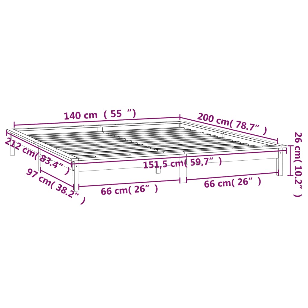 Mit seinem schlichten und zeitlosen Design ist dieses Holzbett mit LED-Leuchten eine praktische und dekorative Ergänzung zu deinem Schlafzimmer. Massives Kiefernholz: Massives Kiefernholz ist ein wunderschönes Naturmaterial. Kiefernholz weist eine gerade Maserung auf und die Aststellen verleihen dem Material seine charakteristische, rustikale Optik.Stabil: Der Holzrahmen sorgt für Robustheit und Stabilität.Mehrfarbige LED-Leuchten: Die mehrfarbigen LED-Leuchten bringen Verspieltheit in die Dunkelheit! Hinweis:Die Lieferung umfasst nur einen Bettrahmen. Die Matratze ist nicht im Lieferumfang enthalten. Die passenden Matratzen finden Sie in unserem Shop.Dieser Bettrahmen ist für eine Matratze mit den Maßen 140 x 200 cm geeignet.Jedes Produkt wird mit einer Montageanleitung in der Verpackung für eine einfache Montage geliefert.Das Produkt verfügt über einen USB-Anschluss, aber die zertifizierte 5-V-USB-Stromquelle ist nicht im Lieferumfang enthalten.