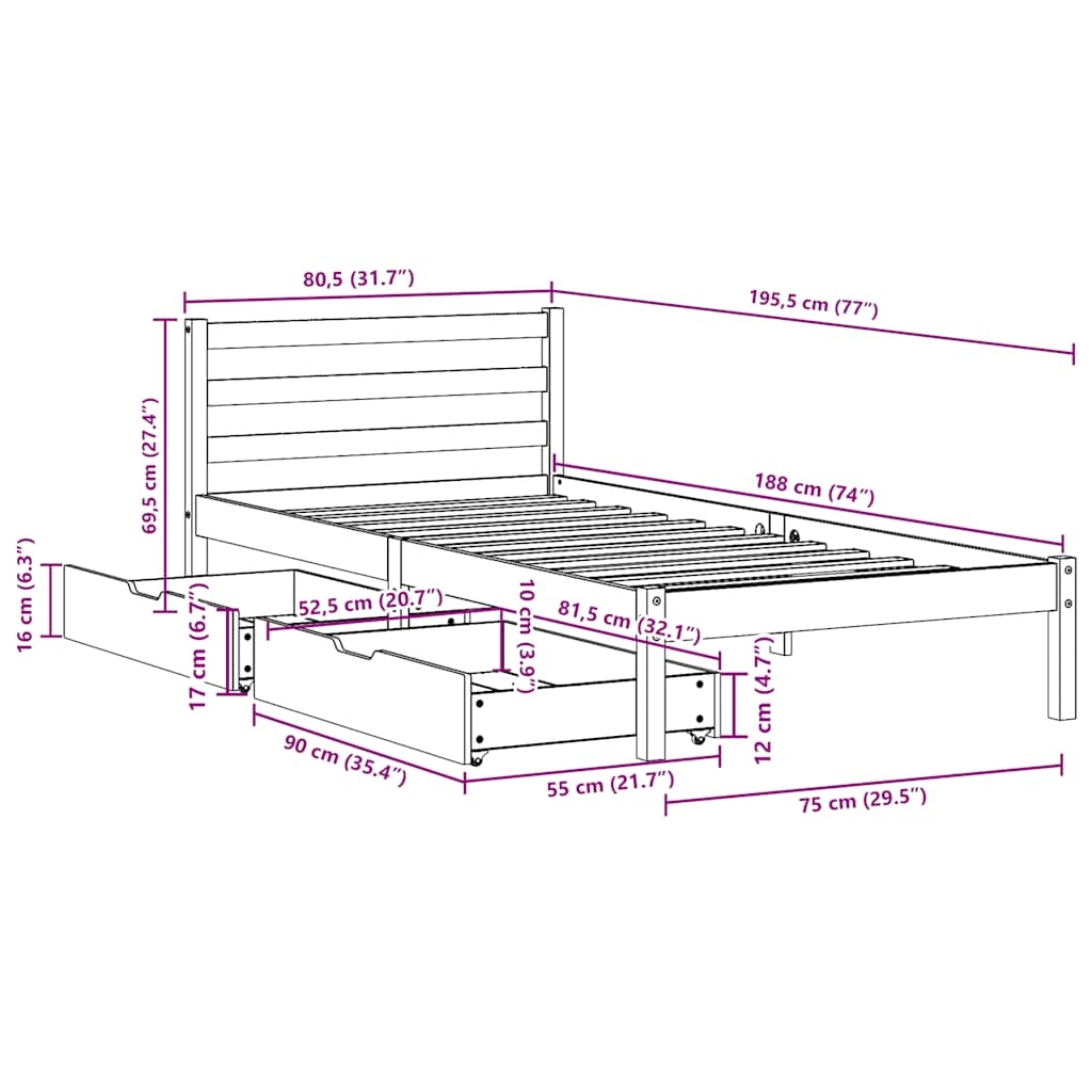 Mit diesem Bett wirst du einen besseren, erholsameren Schlaf genießen! Er ist eine einladende Ergänzung für jedes Schlafzimmer. Stabiles und langlebiges Gestell: Massives Kiefernholz ist für seine Stärke und Haltbarkeit bekannt. Seine gerade Maserung und die charakteristischen Aststellen tragen zu seinem rustikalen Charme bei.Lattenrost für optimale Unterstützung: Der Bettrahmen ist mit einem Lattenrost ausgestattet, der deine Matratze stützt und atmungsaktiv hält.Optimale Ausnutzung des Raumes: Dieser Bettrahmen verfügt über zwei Schubladen, in denen du Sachen wie zusätzliches Bettzeug, saisonale Kleidung und Spielzeug aufbewahren kannst.Leichtgängig: Dank der vier Rollen lässt sich die Unterbettschublade mühelos hineinschieben und herausziehen. Gut zu wissen:Bei diesem Bett ist keine Matratze im Lieferumfang enthalten. Wir bieten jedoch eine große Auswahl an Matratzen an. Du kannst in unserem Shop nach einer passenden Matratze suchen.