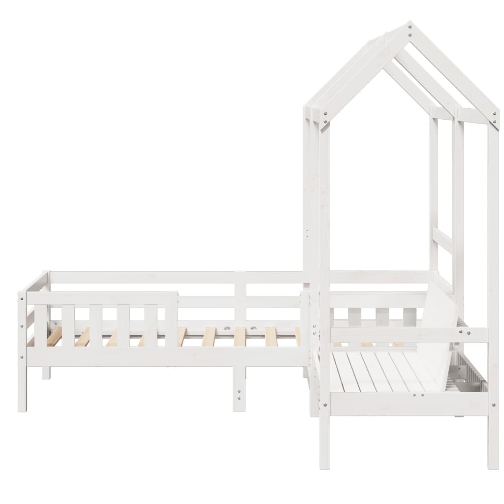 Verleihe deinem Schlafzimmer eine moderne Note mit diesem Bett- und Sitzbank-Set! Es stellt eine praktische und dekorative Ergänzung zu deinem Wohnraum dar. Massives Kiefernholz: Massives Kiefernholz ist ein wunderschönes Naturmaterial. Kiefernholz weist eine gerade Maserung auf und die Aststellen verleihen dem Material seine charakteristische, rustikale Optik.Sperrholzlatten: Die Sperrholzlatten sorgen für eine gute Gewichtsverteilung und auch dafür, dass die Matratze bei jeder Bewegung deines Körpers während des Schlafes an Ort und Stelle bleibt.Praktische Rückenlehne: Die Sitzbank ist mit einer ergonomischen Rückenlehne ausgestattet, um dir vollständige Entspannung zu bieten.Viel Spaß: Durch das Anbringen dieses Dachgestells am Kinderbett kannst du einen Rückzugsort schaffen, der deinem Kind viel Spaß vor dem Schlafengehen bietet. Diese innovative Ergänzung wird nicht nur ein spannender Blickfang sein, sondern auch für Staunen und Spannung im Kinderzimmer sorgen.Modernes Design: Verleihe deiner Inneneinrichtung eine moderne Note! Durch klare Linien, minimalistischen Look und Natürlichkeit fügt er sich sich harmonisch in deine Inneneinrichtung ein. Gut zu wissen:Bei diesem Bett ist keine Matratze im Lieferumfang enthalten. Wir bieten jedoch eine große Auswahl an Matratzen an. Du kannst in unserem Shop nach einer passenden Matratze suchen.